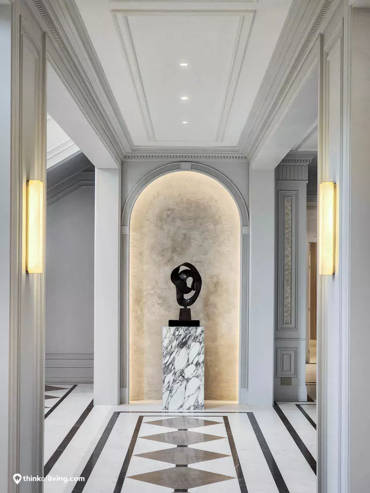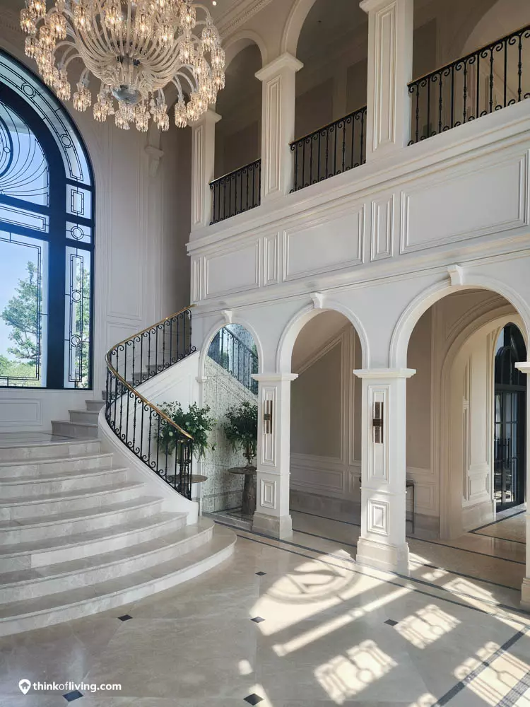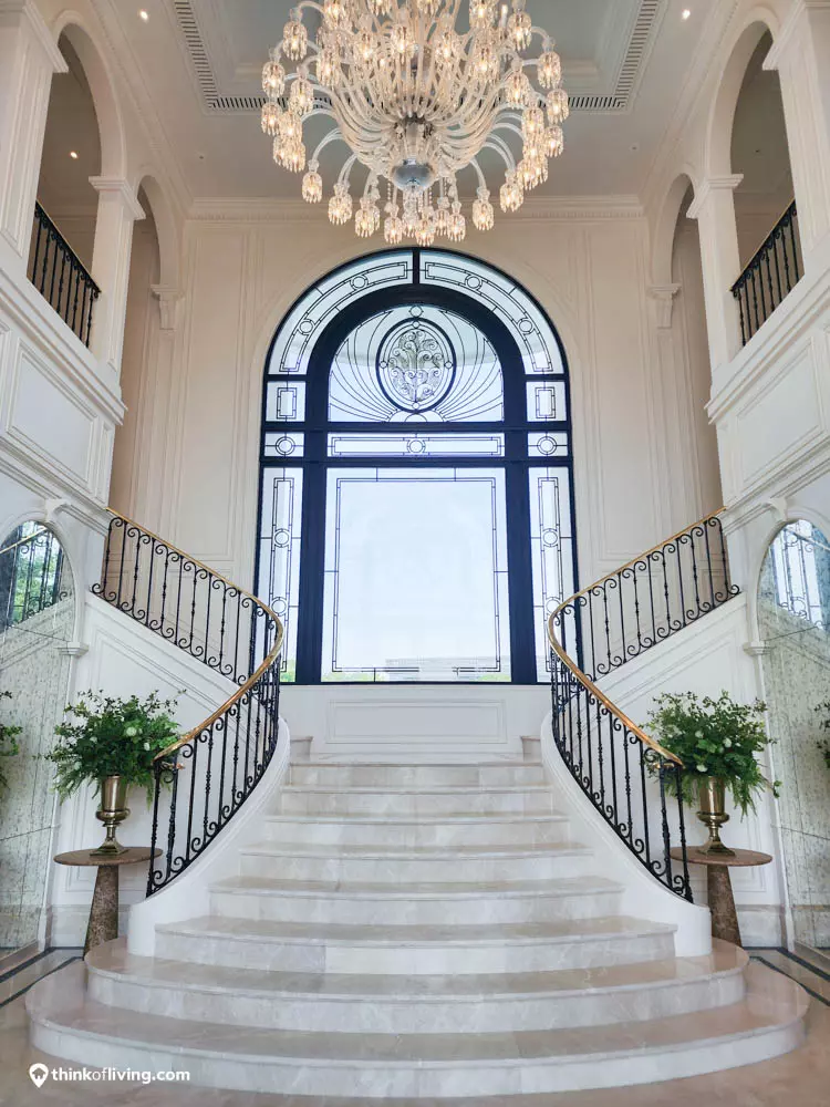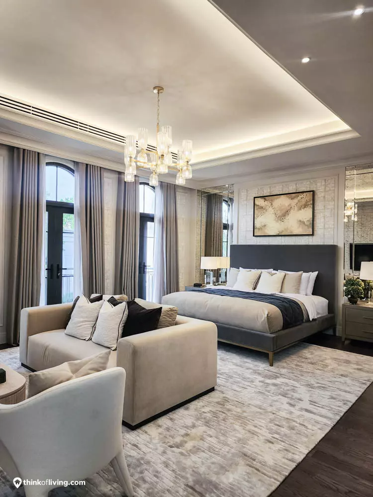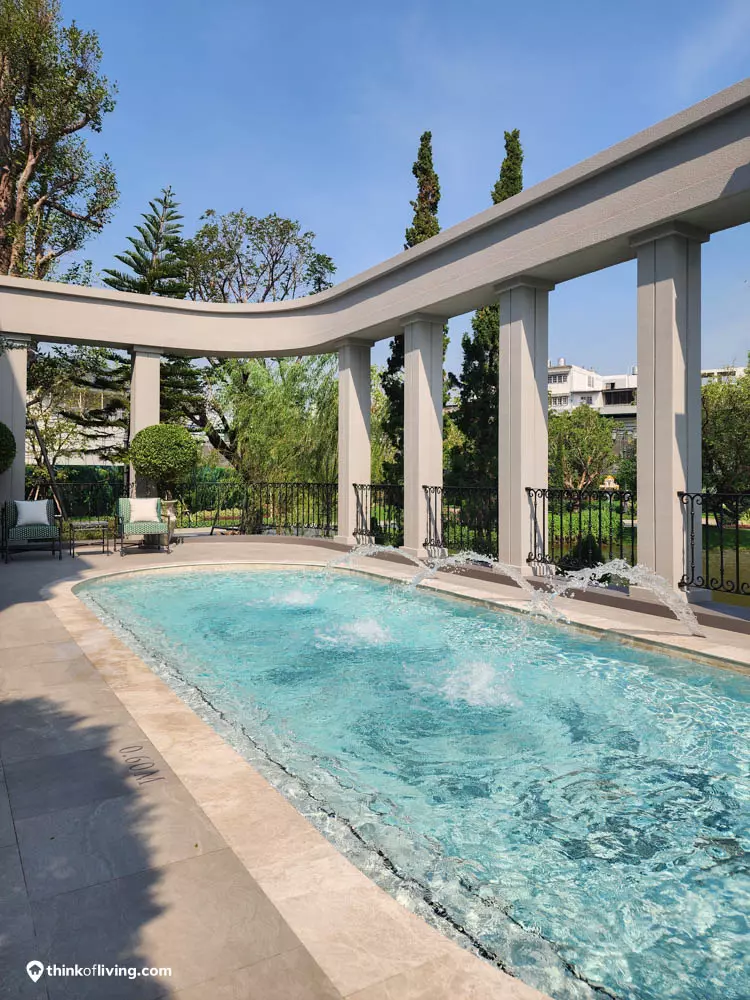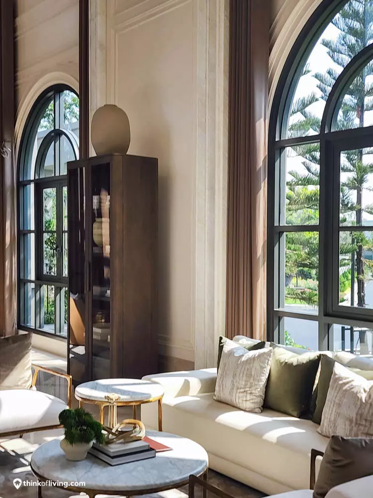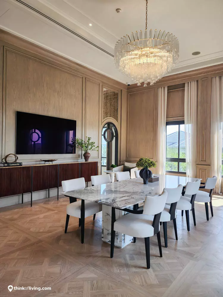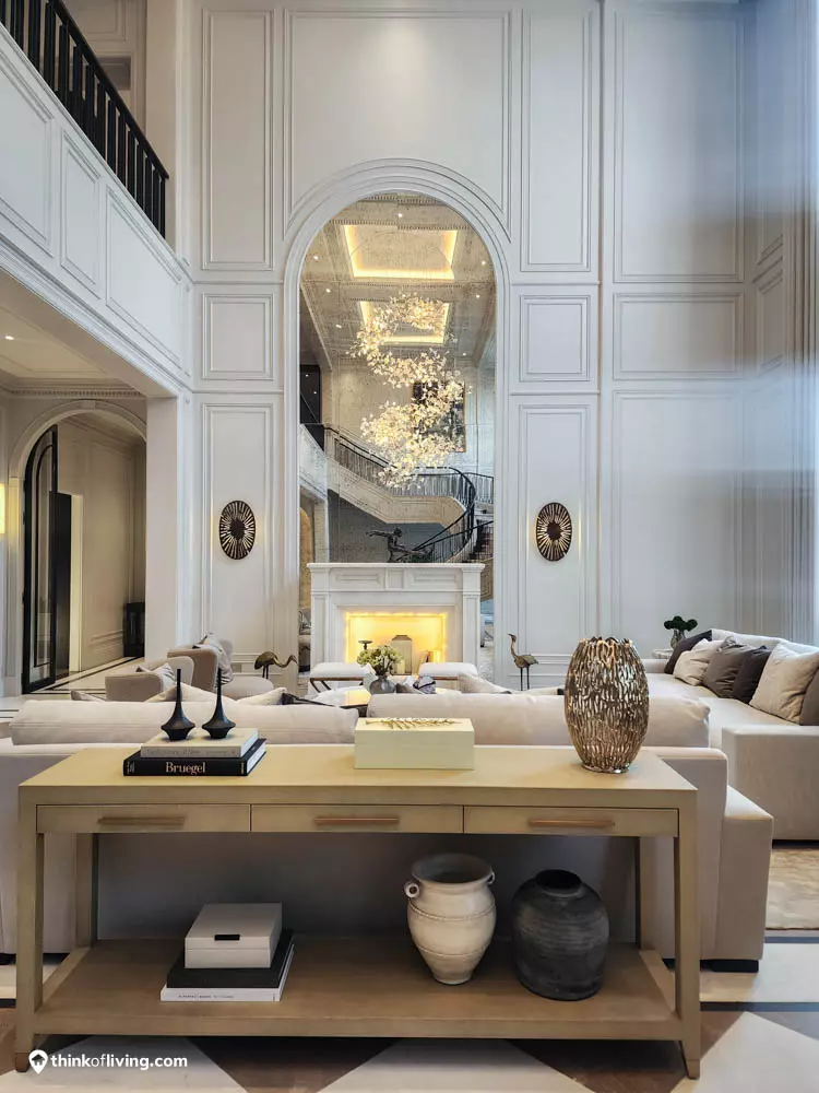 ตัวบ้านได้แรงบันดาลใจจากสไตล์ Regency ในช่วงต้นศตวรรษที่ 19 เน้นความหรูหรา คลาสสิกแบบพระราชวังบักกิงแฮม โดดเด่นด้วยความสมมาตร สัดส่วนขนาดใหญ่ และรายละเอียดอย่างซุ้มโค้ง ลูกฟัก เสากลม และบัวหัวเสา พร้อมสี Earth Tone นุ่มนวล ช่วยให้อาคารที่ดูหนักแน่น มีความละมุนนุ่มนวลยิ่งขึ้น