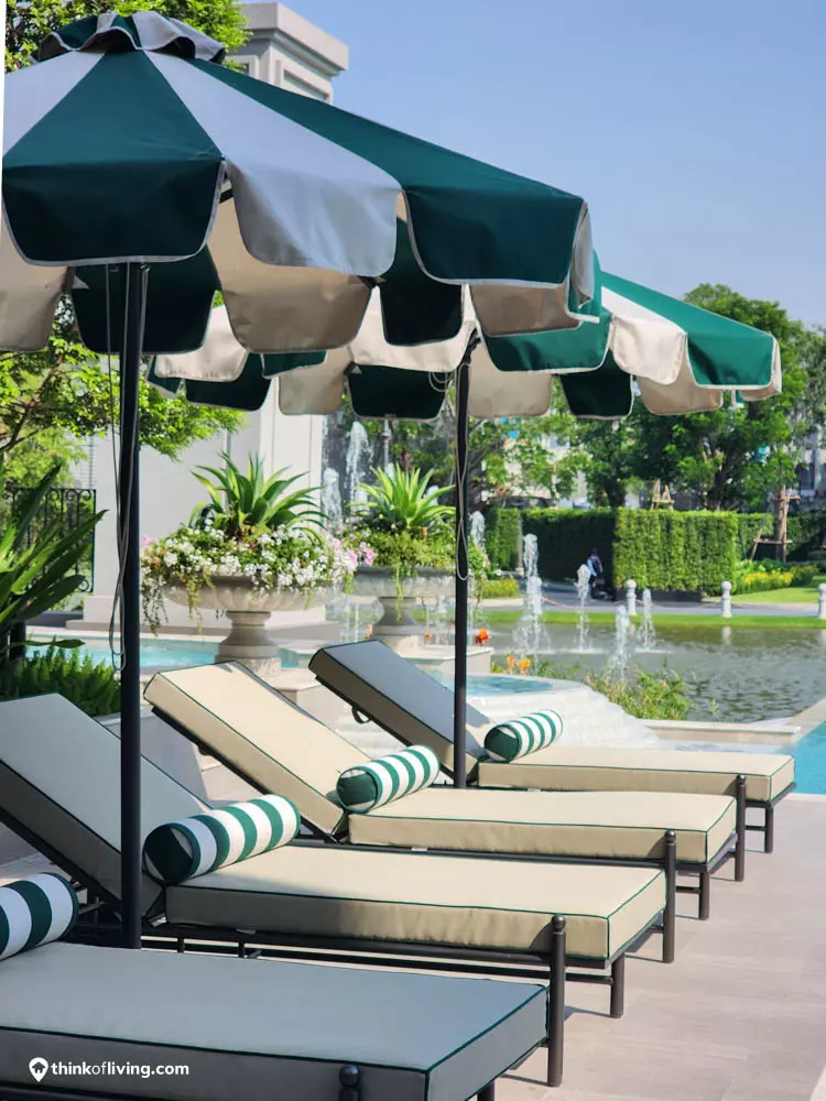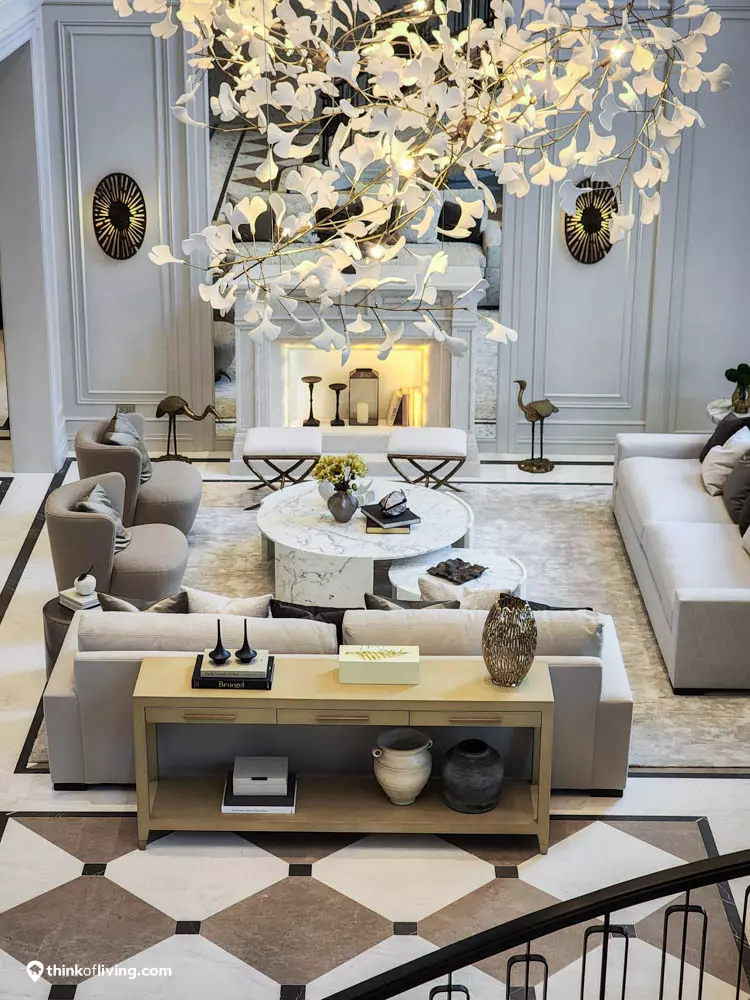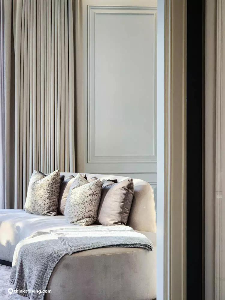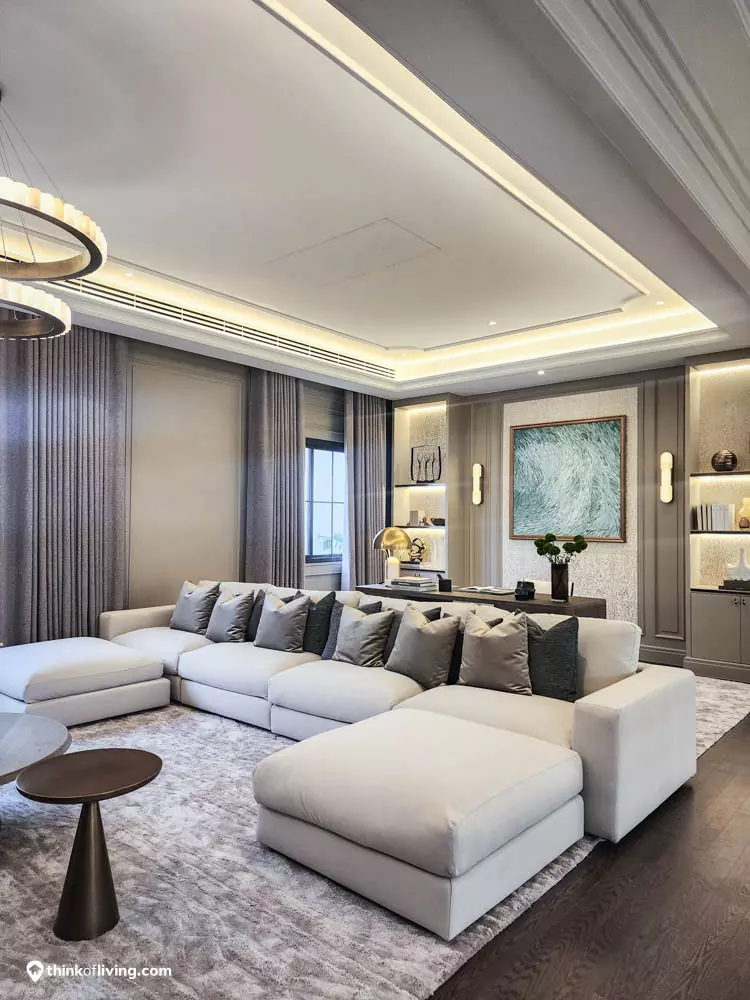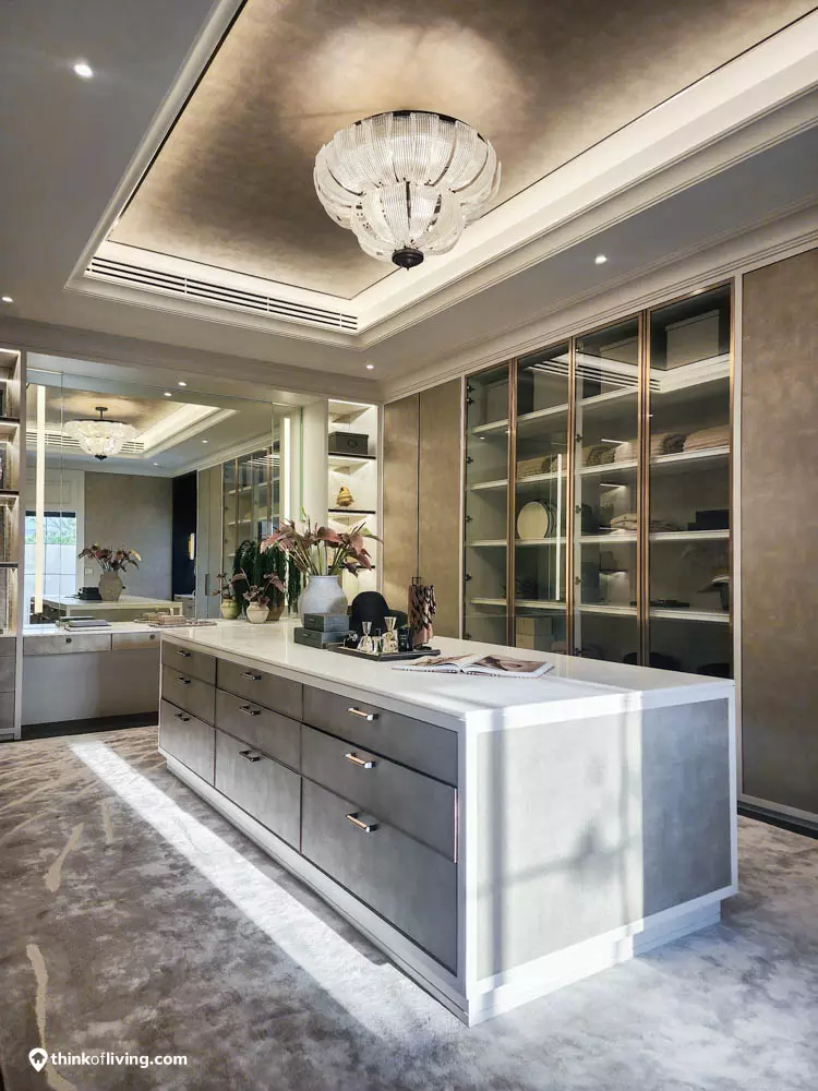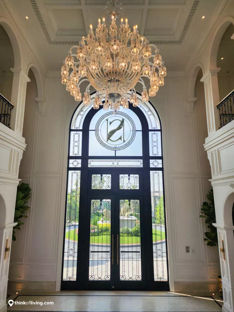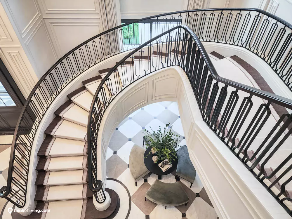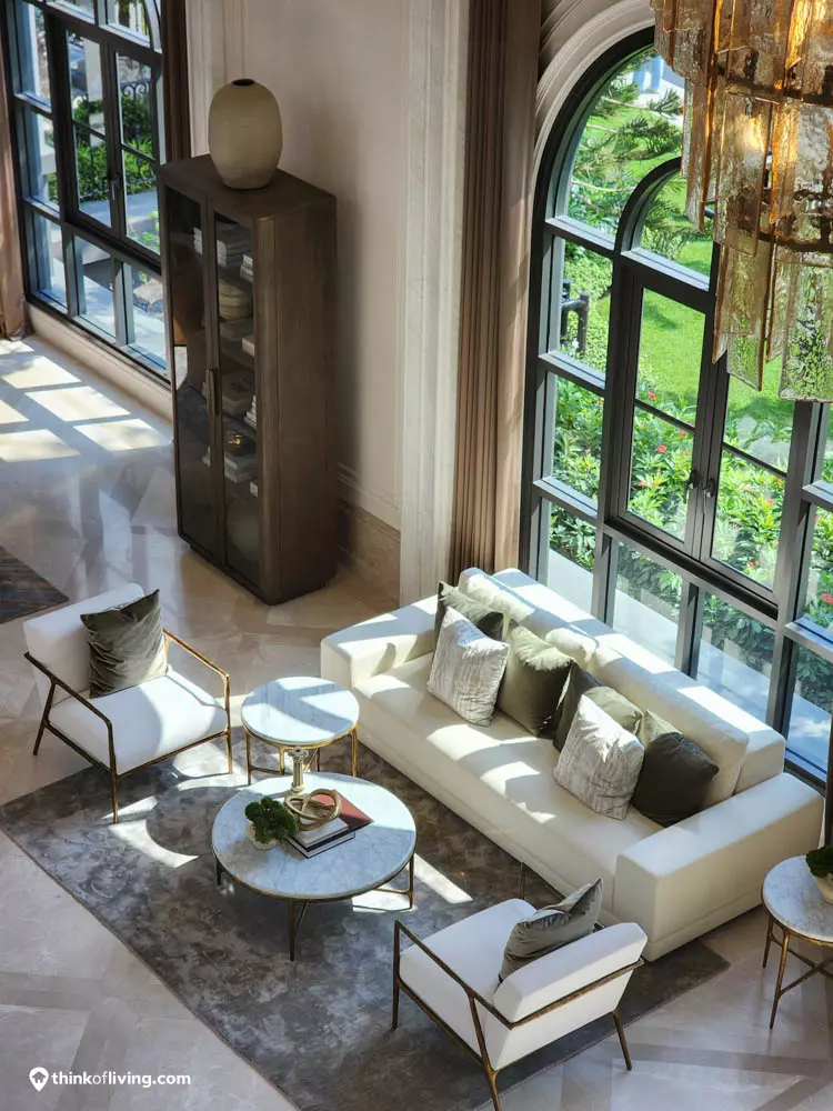 ตัวบ้านได้แรงบันดาลใจจากสไตล์ Regency ในช่วงต้นศตวรรษที่ 19 เน้นความหรูหรา คลาสสิกแบบพระราชวังบักกิงแฮม โดดเด่นด้วยความสมมาตร สัดส่วนขนาดใหญ่ และรายละเอียดอย่างซุ้มโค้ง ลูกฟัก เสากลม และบัวหัวเสา พร้อมสี Earth Tone นุ่มนวล ช่วยให้อาคารที่ดูหนักแน่น มีความละมุนนุ่มนวลยิ่งขึ้น