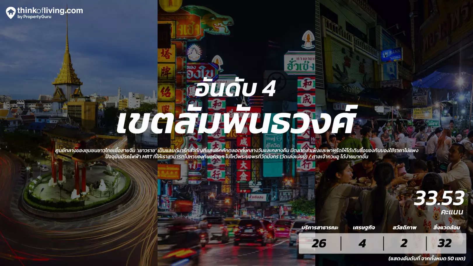 นี่คือศูนย์กลางของชุมชนชาวไทยเชื้อสายจีน หลายๆครอบครัวมักประกอบอาชีพค้าขายหรือเปิดกิจการที่สืบทอดกันมาตั้งแต่สมัยบรรพบุรุษ เกิดเป็นชุมชนขนาดใหญ่ที่มีชื่อว่า ‘เยาวราช’ เป็นแลนด์มาร์กสำคัญที่แสนคึกคักตลอดทั้งกลางวันและกลางคืน อีกทั้งยังมีตลาดสำเพ็งและพาหุรัดให้ได้เดินซื้อของกินของใช้ราคาไม่แพงอีกด้วย จึงไม่แปลกใจเลยที่จะได้หัวข้อ ‘เศรษฐกิจ อันดับ 4’ และยังได้เรื่อง ‘สวัสดิภาพ อันดับ 2’ อีกด้วย