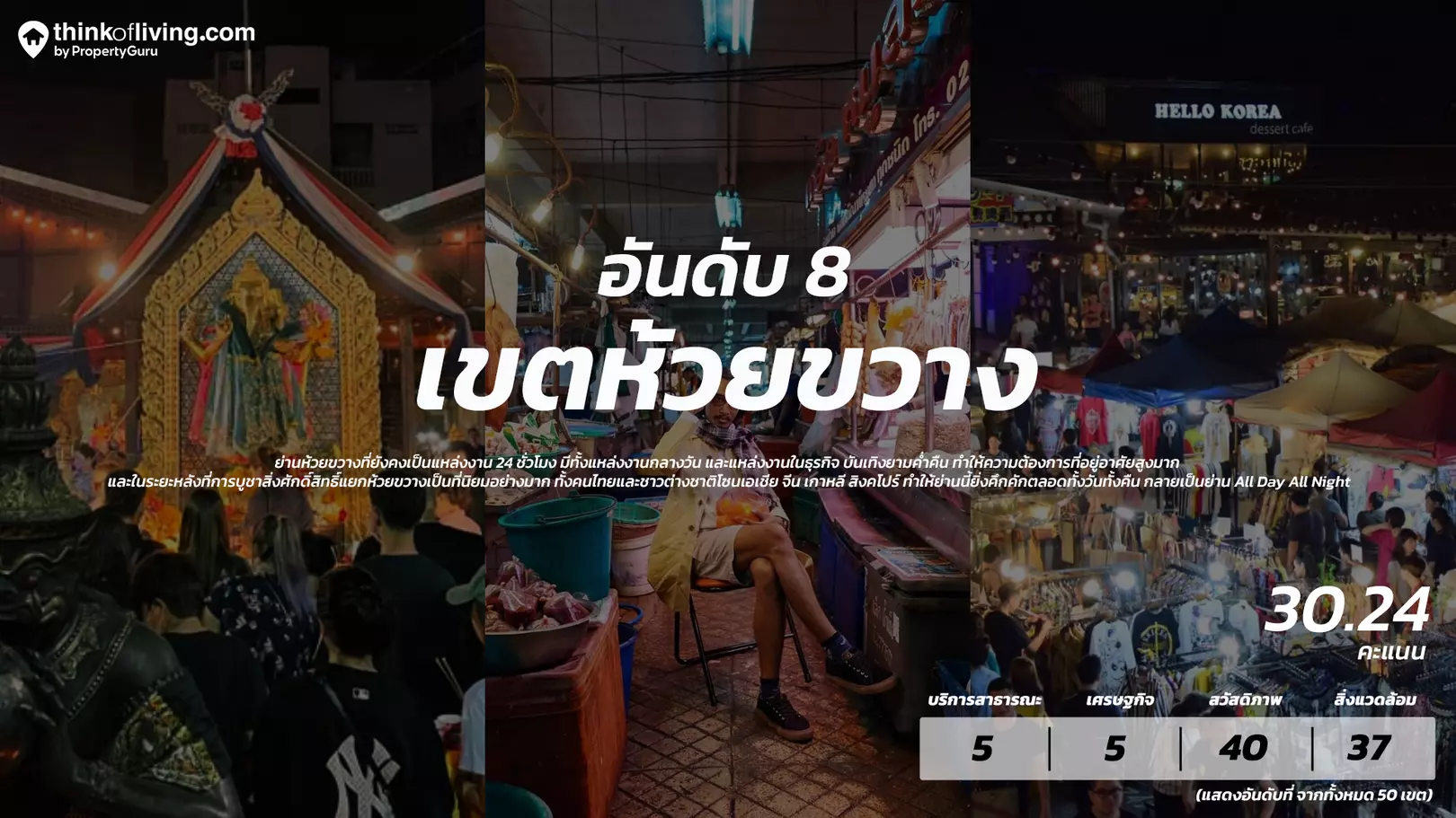 ทำให้ย่านนี้ยิ่งคึกคักตลอดทั้งวันทั้งคืน กลายเป็นย่าน All Day All Night ที่แท้ทรู จึงไม่แปลกใจที่เขตห้วยขวางจะโดดเด่นในหัวข้อ ‘เศรษฐกิจ อันดับ 4’ อีกทั้งยังมีสิ่งอำนวยความสะดวกที่ครบครันมาก ไม่ว่าจะเป็นห้างสรรพสินค้า อาคารสำนักงานขนาดใหญ่ RCA และรถไฟฟ้าใต้ดิน MRT เลยได้คะแนนหัวข้อ ‘บริการสาธารณะ อันดับ 4’ ไปด้วยเช่นกันครับ