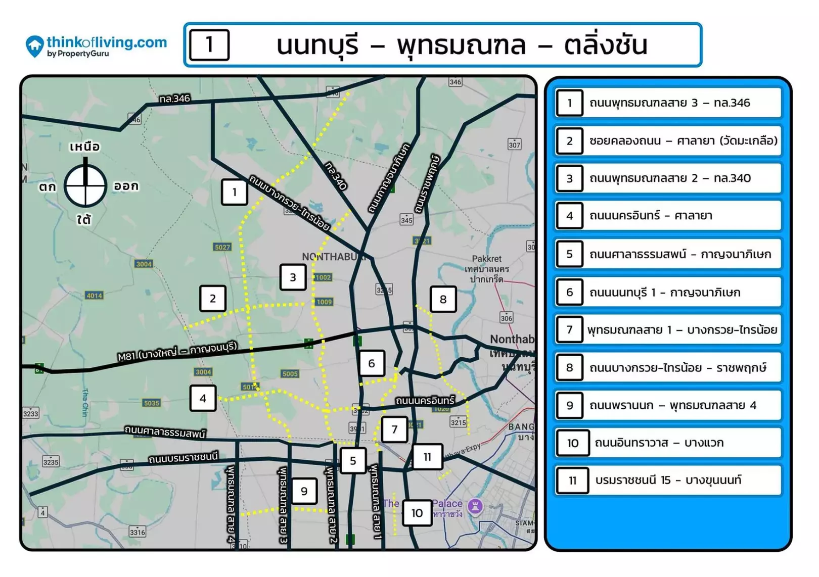 ถนนราชพฤกษ์-นนทบุรี 1 ก็เป็นโซนที่ Developer ชอบมาเปิดตัวเช่นกัน แต่บรรยากาศจะดูเงียบสงบกว่าโซนบางเลนที่มีความเป็นชุมชนมากกว่า ข้อดีของโซนนี้คือ ใกล้สะพานมหาเจษฎาบดินทร์ จึงข้ามแม่น้ำไปทางฝั่งสนามบินน้ำ, ไปท่าน้ำนนท์ได้สะดวก