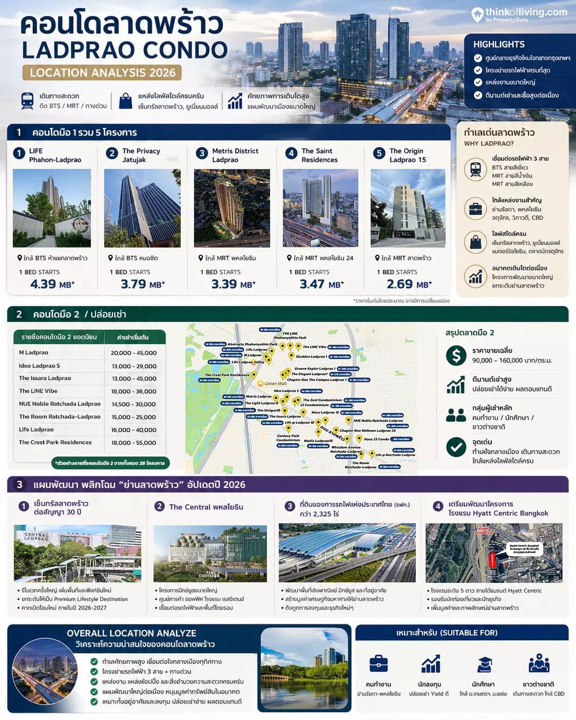 อีกทั้งทำเลย่านนี้ยังมีที่ดินแปลงใหญ่ให้เอกชนได้พัฒนาอีกครับ โดยส่วนใหญ่ก็จะเป็นที่ดินของการรถไฟแห่งประเทศไทย (รฟท.) รวมกว่า 2,325 ไร่ และที่ดินที่ Central ได้ต่อสัญญาเช่ามาพัฒนาโครงการต่อให้ใหญ่มากขึ้นกว่าเดิมอีก จึงยิ่งทำให้ที่อยู่อาศัยย่าน ‘ลาดพร้าว’ มีความน่าสนใจมากขึ้น ซึ่งในบทความนี้เราได้แบ่งออกเป็น 3 พาร์ทใหญ่ๆ ดังนี้