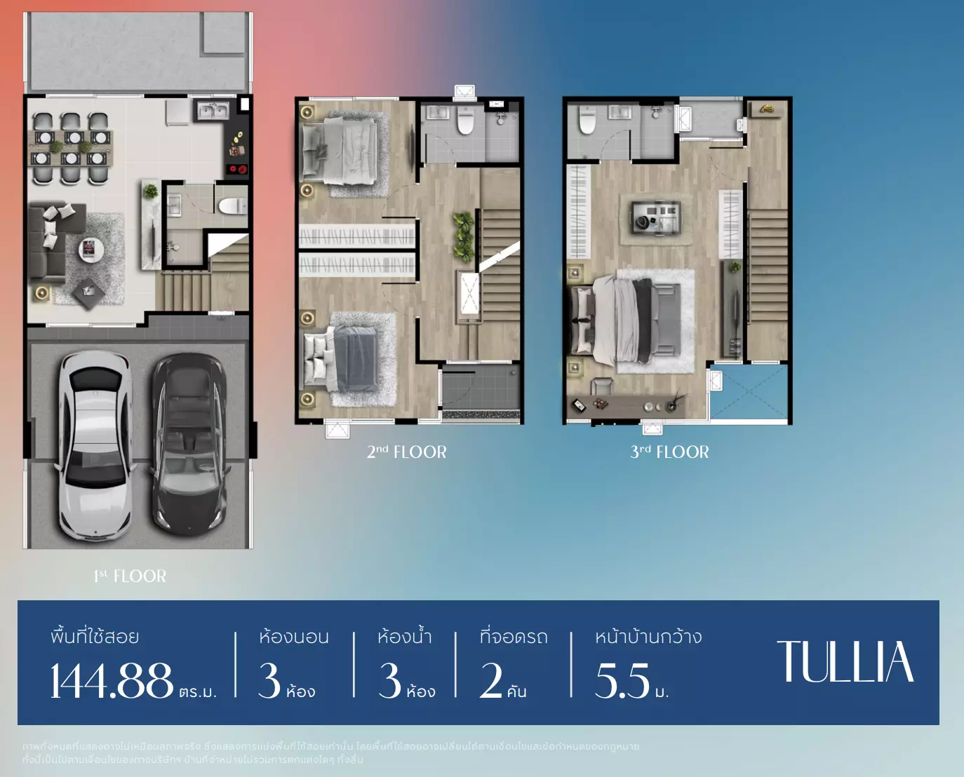 TULLIA ทาวน์โฮม 3 ชั้น หน้ากว้าง 5.5 เมตร ที่ดินเริ่มต้น n/a ตร.วา พื้นที่ใช้สอย 144.88 ตร.ม. จัดฟังก์ชัน 3 ห้องนอน / 3 ห้องน้ำ / 2 ที่จอดรถ ราคาเริ่มต้น 4.79 ล้านบาท มีจุดเด่นคือห้องนอน Master Bedroom ขนาดใหญ่บนชั้น 3 ได้กระจดเข้ามุม เปิดรับแสงธรรมชาติได้กว้าง