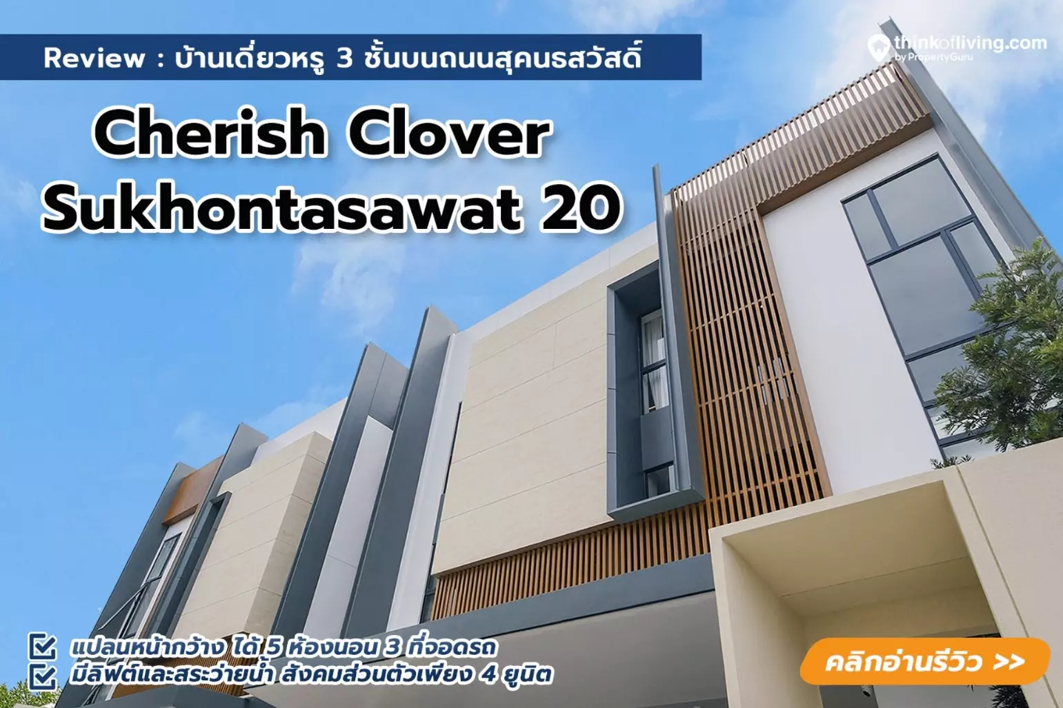 Cherish Clover Sukhontasawat 20 (เฌอริช โคลเวอร์ สุคนธสวัสดิ์ 20) เป็นโครงการบ้านเดี่ยว 3 ชั้นที่มีเพียง 4 ยูนิต เหมาะกับคนที่ชอบโครงการยูนิตน้อย แต่ได้รั้วรอบขอบชิดให้ความรู้สึกปลอดภัยและเป็นส่วนตัวมากกว่าโครงการที่เป็น Stand Alone การออกแบบมาในสไตล์ “Modern Luxury” ได้พื้นที่ใช้สอย 450 – 500 ตร.ม. บนที่ดินเริ่มต้น 56.7 – 61.3 ตร.วา มาพร้อมฟังก์ชัน 5 ห้องนอน 6 ห้องน้ำ 3 ที่จอดรถ และ 1 ห้องแม่บ้านน ในราคาเริ่มต้น 36.9 ล้านบาท* มีสระว่ายน้ำส่วนตัวและลิฟต์โดยสารติดตั้งมาให้พร้อมใช้งาน หากเป็นครอบครัวใหญ่ที่มีผู้สูงอายุอยู่ด้วยก็สามารถใช้งานได้สบายๆ โดยวัสดุที่ได้และบรรยากาศในบ้านตัวอย่าง จะเป็นยังไงบ้างไปชมกันค่ะ