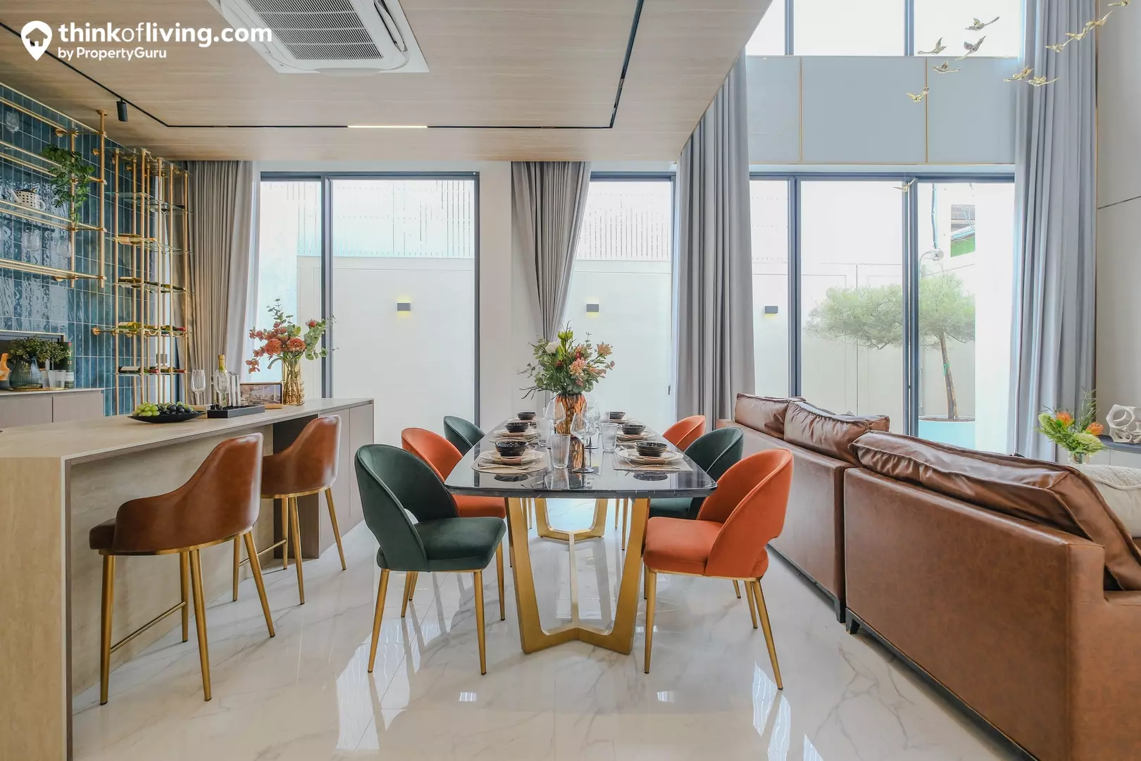 เมื่อเปิดประตูเข้ามาจะเจอ Common Area ขนาดใหญ่ ดูโปร่งโล่ง ด้านข้างได้ประตูบานเลื่อนกระจกหลายจุด ทำให้สามารถ Take View สระว่ายน้ำด้านหลังได้แบบ 180 องศา ถือเป็นข้อดีของแปลนหน้ากว้าง วัสดุพื้นในบ้านมาตรฐานจะได้เป็นกระเบื้องแกรนิตโต้ขนาด 60×120 เซนติเมตร