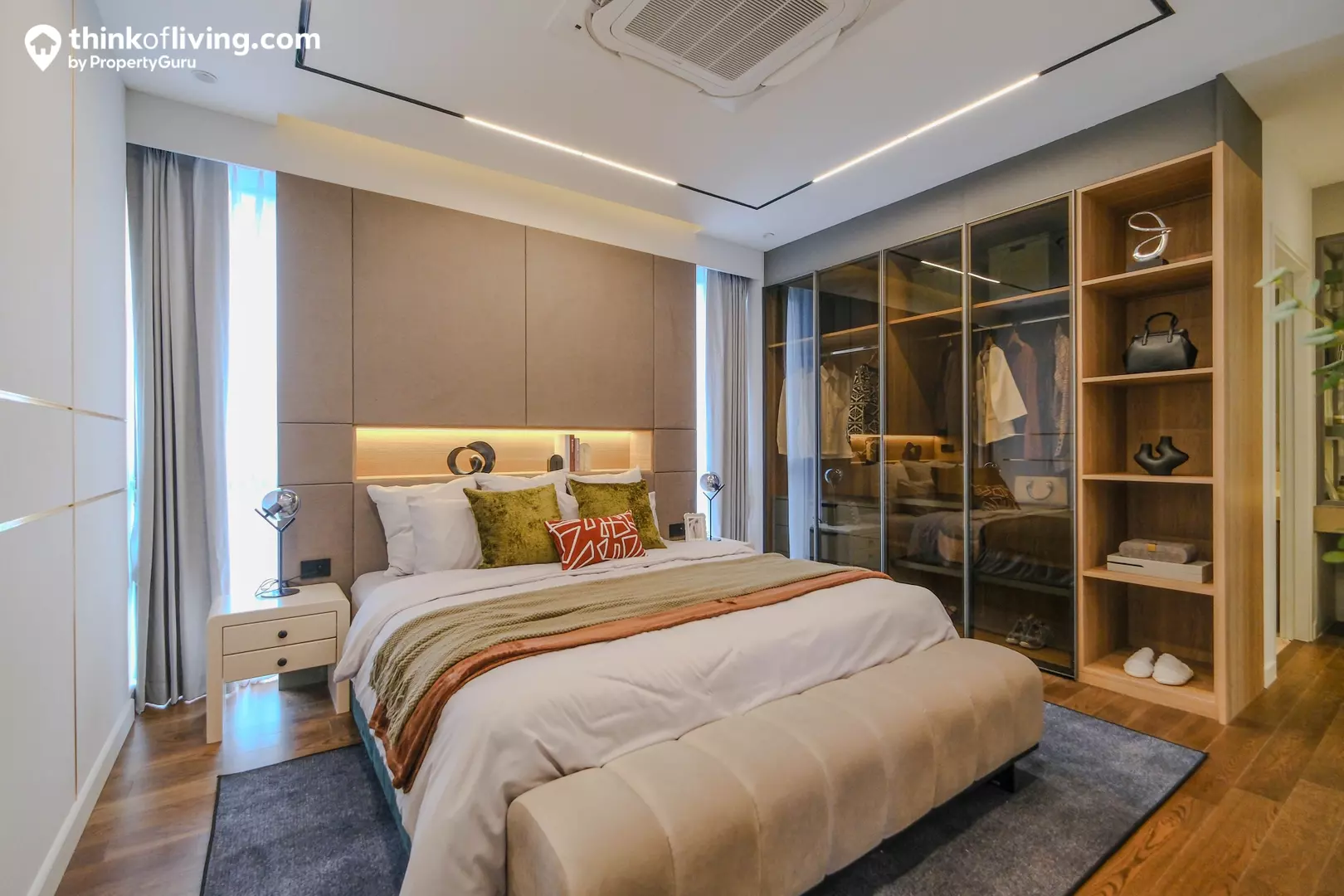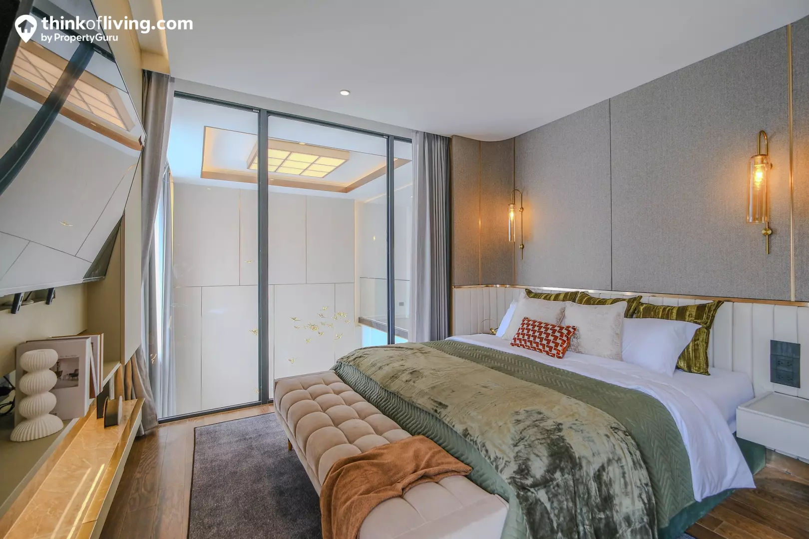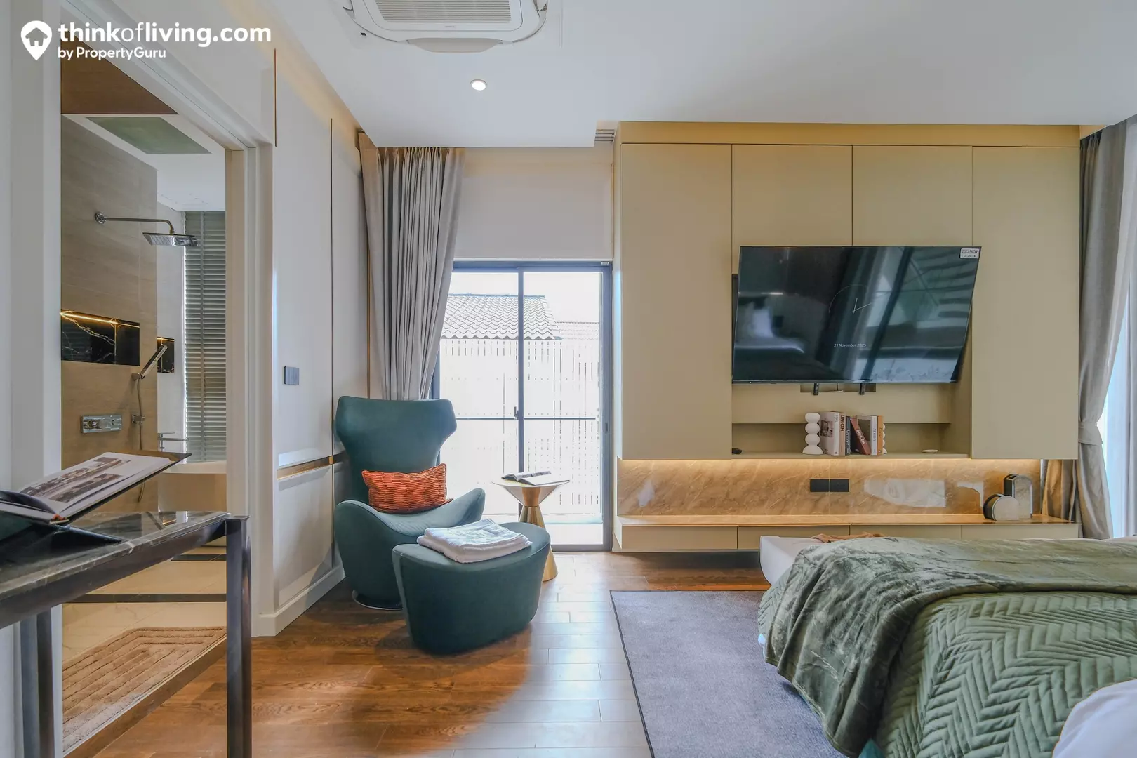 อีกฝั่งเป็นพื้นที่วางเตียงนอน ด้านข้างมีผนังกระจกสูงถึงฝ้าเชื่อมต่อกับ Double Volume ดูโปร่งโล่งมาก เพิ่มความ Grand ให้กับห้อง Master Bedroom ได้ดี ตรงกลางวางเตียงได้ 5 – 6 ฟุต โดยด้านข้างยังเหลือพื้นที่ให้จัดเป็นมุมอเนกประสงค์ วางเก้าอี้ไว้เอนหลังอ่านหนังสือแบบชิลๆได้