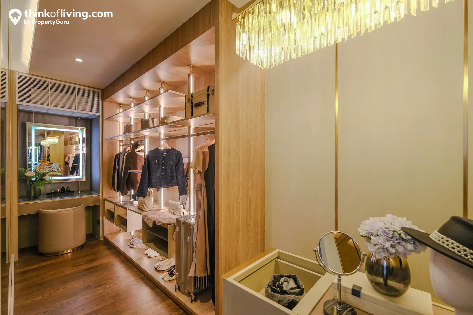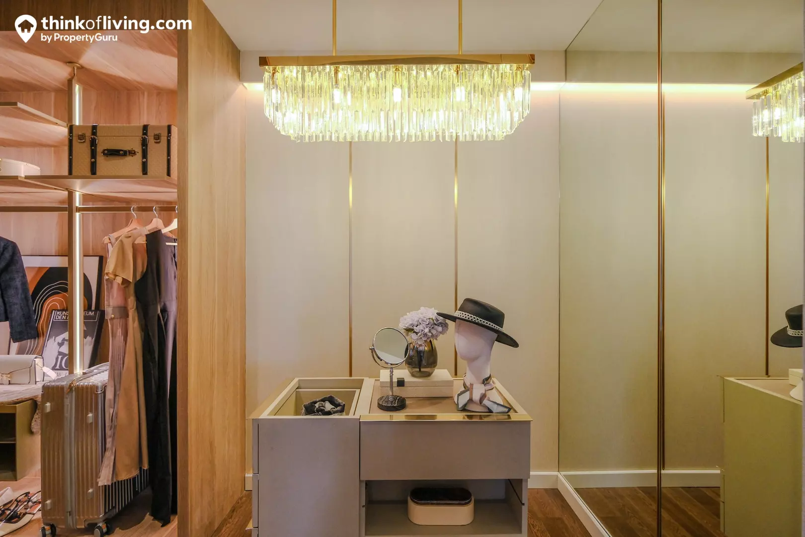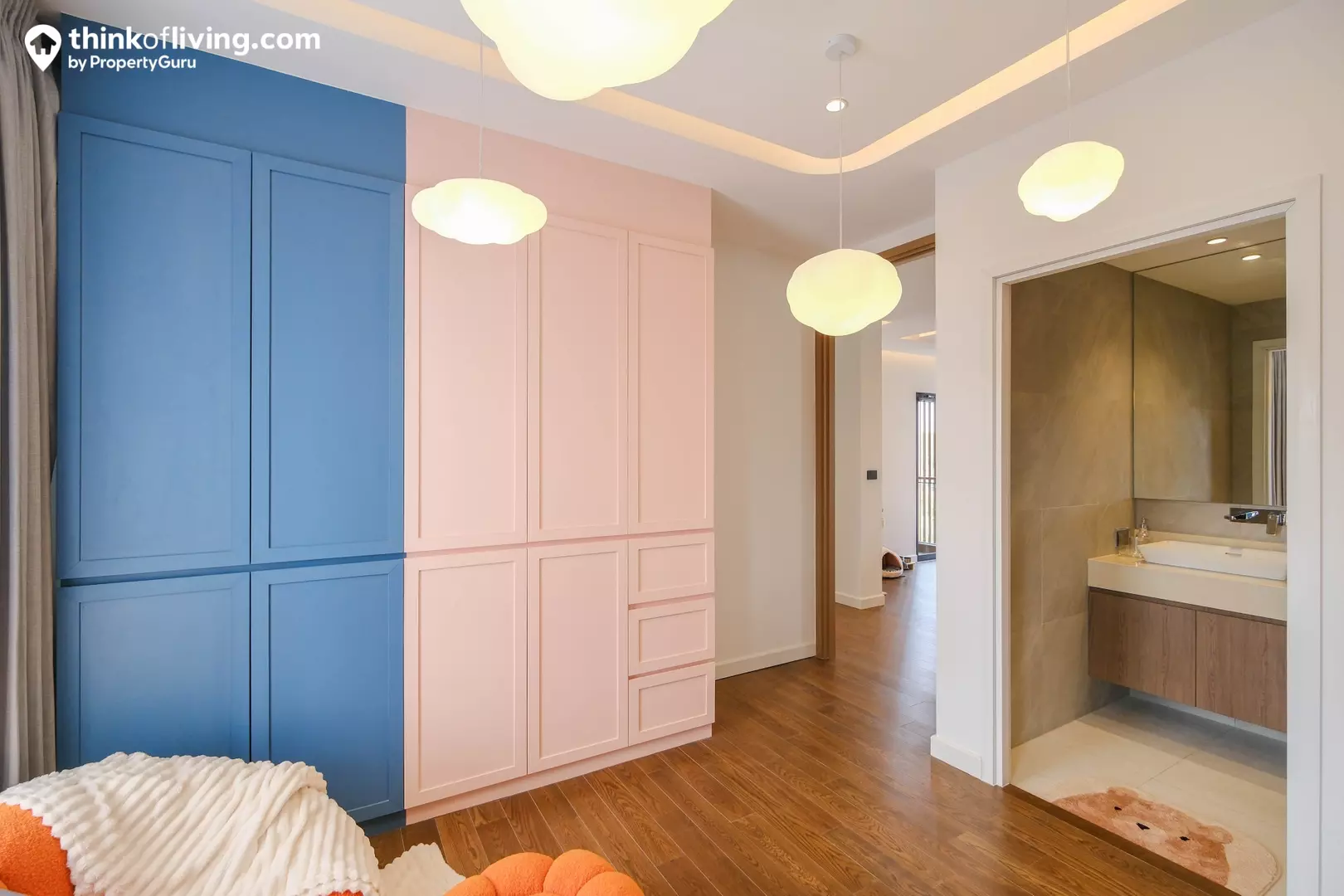 ทุบห้องรวมกันแล้ว ทำให้ได้ Walk – in Closet ขนาดใหญ่ขึ้น มีพื้นที่ให้วาง Island พร้อม Built – in ตู้เสื้อผ้า , โต๊ะเครื่องแป้งมาให้ครบ แบ่งกันใช้งาน 2 คนทั้งคุณผู้ชายและคุณผู้หญิงได้สะดวกมาก