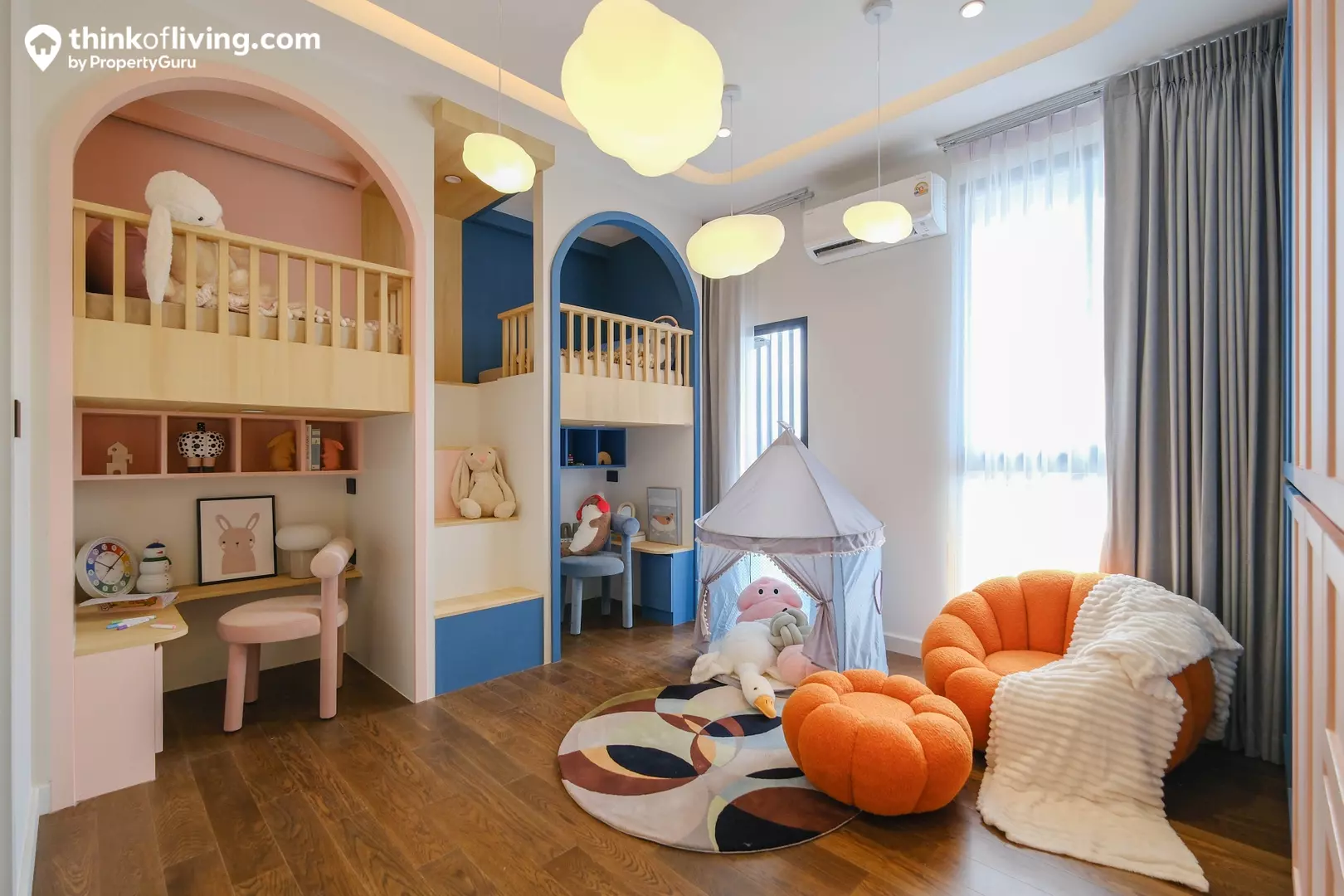 ห้องนอนของบ้านได้ห้องน้ำในตัวทุกห้อง โดยห้องนี้บ้านตัวอย่างตกแต่งเป็นห้องสำหรับเด็กๆ เหมาะกับบ้านที่มีลูกเล็กก็สามารถใช้ด้วยกันได้ หรือโตแล้วจะแยกห้องส่วนตัวก็มีรองรับหลายห้อง ใช้งานได้สะดวก