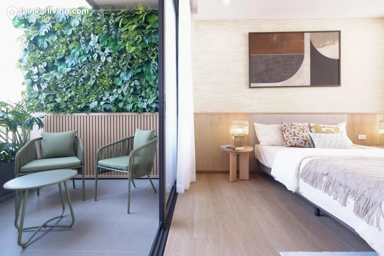 ต่อมาเราจะพาไปดูระเบียงส่วนตัวของห้องนอน 1 กัน โดยจะอยู่ถัดจากพื้นที่เตียงนอนเลย