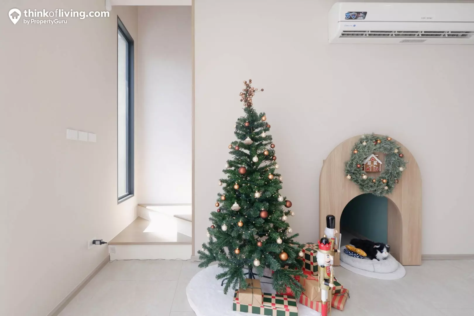 สำหรับพื้นที่นั่งเล่นใน Master Bedroom จะอยู่ฝั่งด้านหน้าบ้าน โดยมีขนาดประมาณ 3.50×5.95 เมตร ซึ่งเราสามารถตกแต่งเหมือนบ้านตัวอย่างได้เลย ไม่ว่าจะเป็นตั้งชั้นวางทีวี มีโซฟายาวและโต๊ะเล็กๆ รวมถึงมีบ้านของน้องแมวตั้งอยู่ข้างๆ มีพื้นที่ริมหน้าต่างมีความกว้าง 2.60 เมตร จึงทำเป็นมุมนั่งทำงานได้เลยนั่นเอง ส่วนพื้นที่แต่งตัวแบบ Walk-in Closet และ Master Bathroom จะอยู่ด้านข้าง