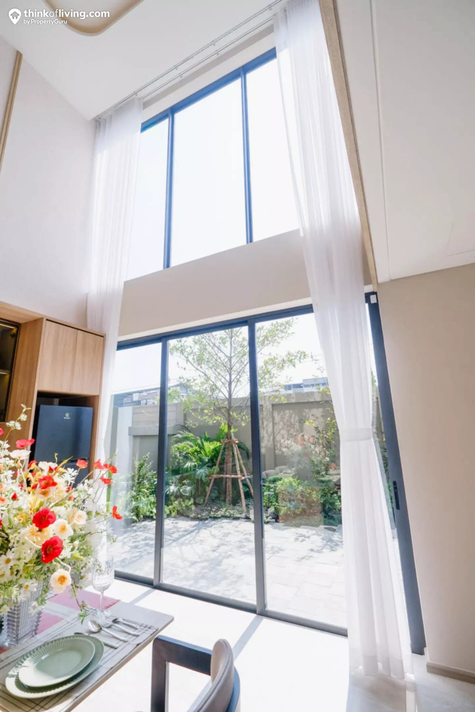 - เน้นความโปร่งโล่งภายในบ้าน นอกจากการออกแบบพื้นที่ Open Plan ของ Common Area และ Master Bedroom รวมถึงเน้นช่องหน้าต่างขนาดใหญ่และเยอะแล้ว ยังมีพื้นที่ Double Volume ฝ้าเพดานสูง 5.95 เมตรในทาวน์โฮมด้วย