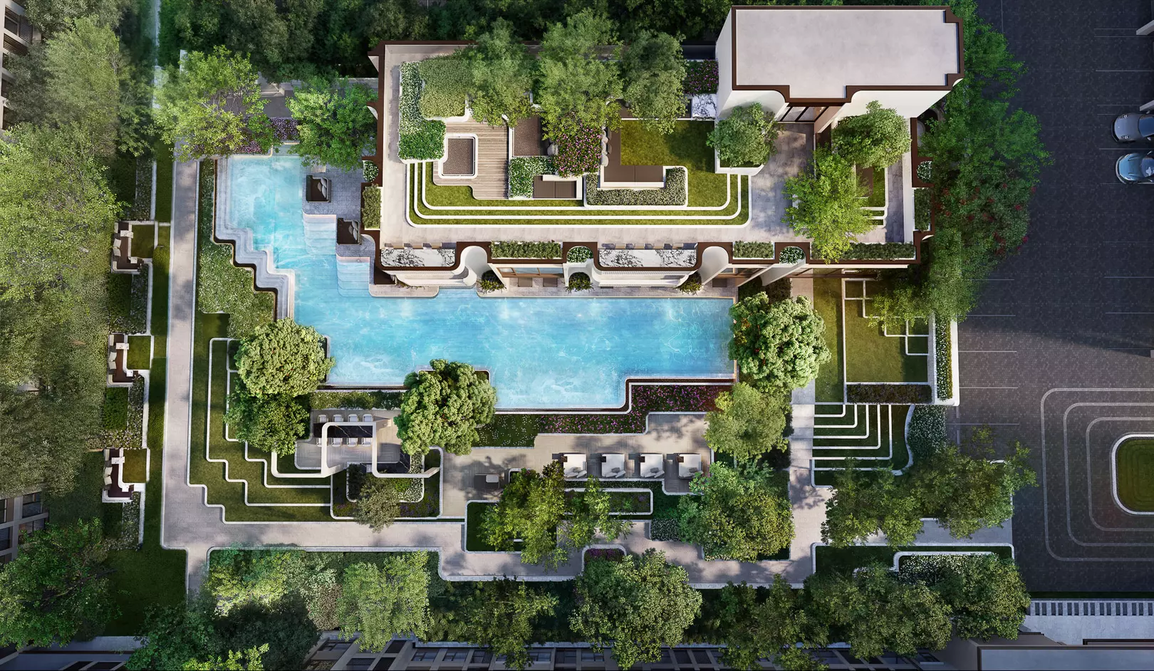 ในส่วนของดีไซน์โครงการมาในสไตล์ De Midcentury ดูเท่ๆ ทันสมัย แต่ยังคงกลิ่นอายที่หรูหรา ฟอร์มของอาคารอาจดูเป็น Geometric ง่ายๆ แต่มีดีเทลอย่าง การตกแต่งผนังให้เป็นทรงโค้ง มีการเล่นแสงเงาดูสวยงาม