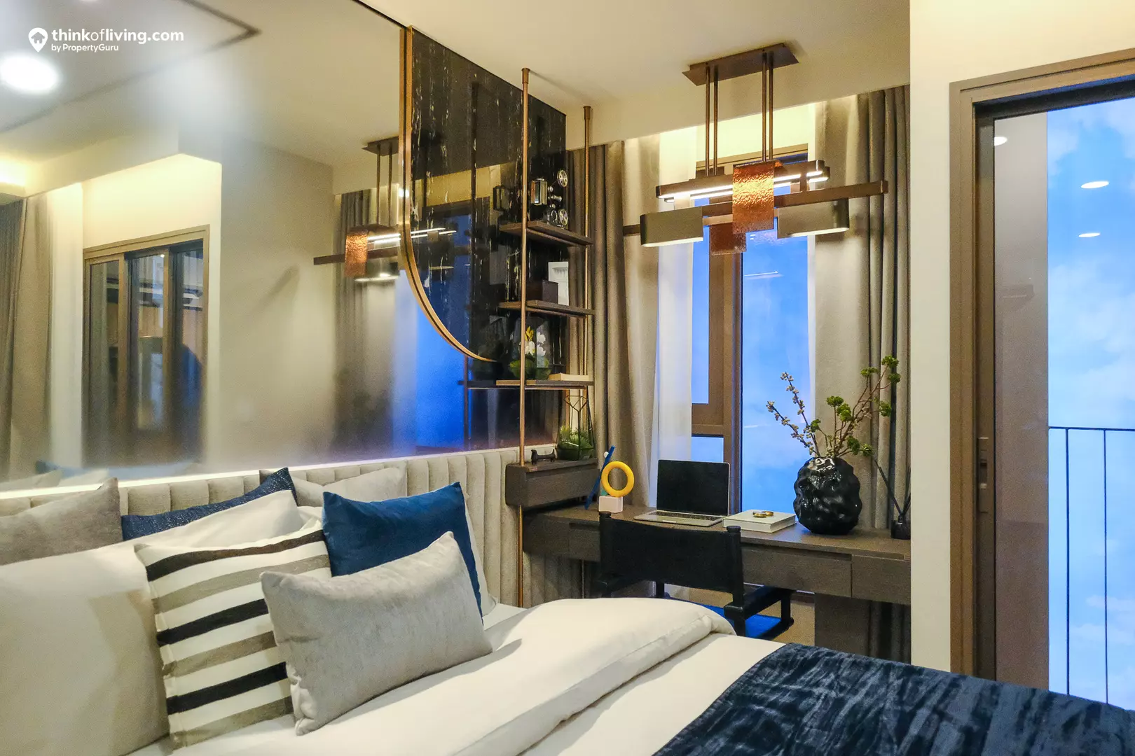 ในส่วนของห้องนอนจะกั้นห้องประตูกระจกบานเลื่อนขนาดใหญ่ 3 ตอน เปิดได้กว้างถึง 1.2 m. ทำให้ตัวห้องดูโปร่งโล่ง แต่ก็จะให้ความเป็นส่วนตัวน้อยกว่าประตูบานทึบ หากไม่ได้อยู่คนเดียวเราแนะนำให้ติดม่านตามแนวประตูเพิ่มอีกนิดนึง จะช่วยสร้างความเป็นส่วนตัวมากขึ้น เวลาแฟนดูทีวีดึกๆ แล้วเราจะเข้านอนก่อนจะได้ไม่รบกวนกันค่ะ