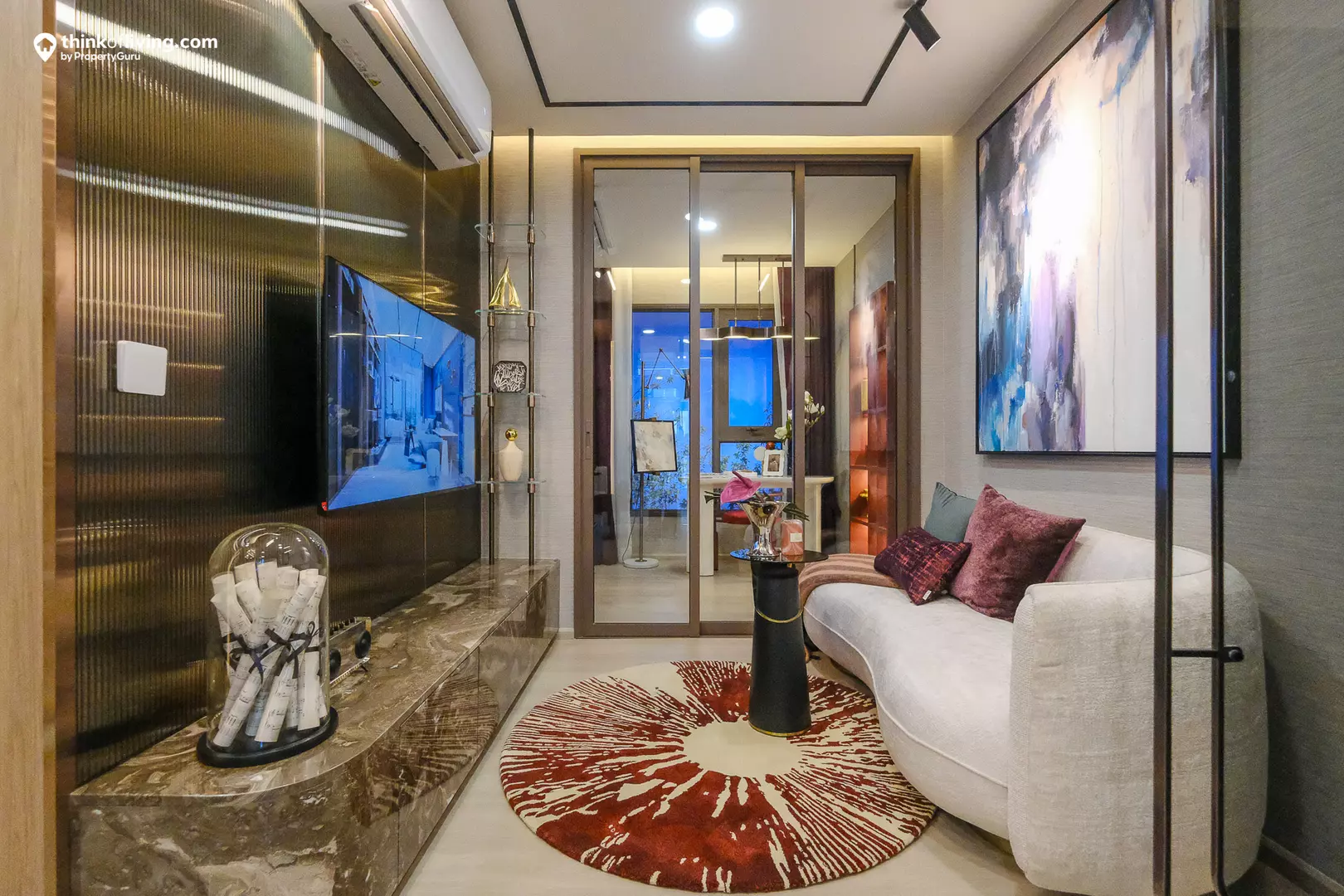 พื้นที่ดูทีวีสามารถวางชุดโซฟาแบบ 2-3 ที่นั่งได้พอดีๆ มีระยะดูทีวีประมาณ 3 m. ใช้ทีวีขนาดประมาณ 55 นิ้วกำลังดีค่ะ