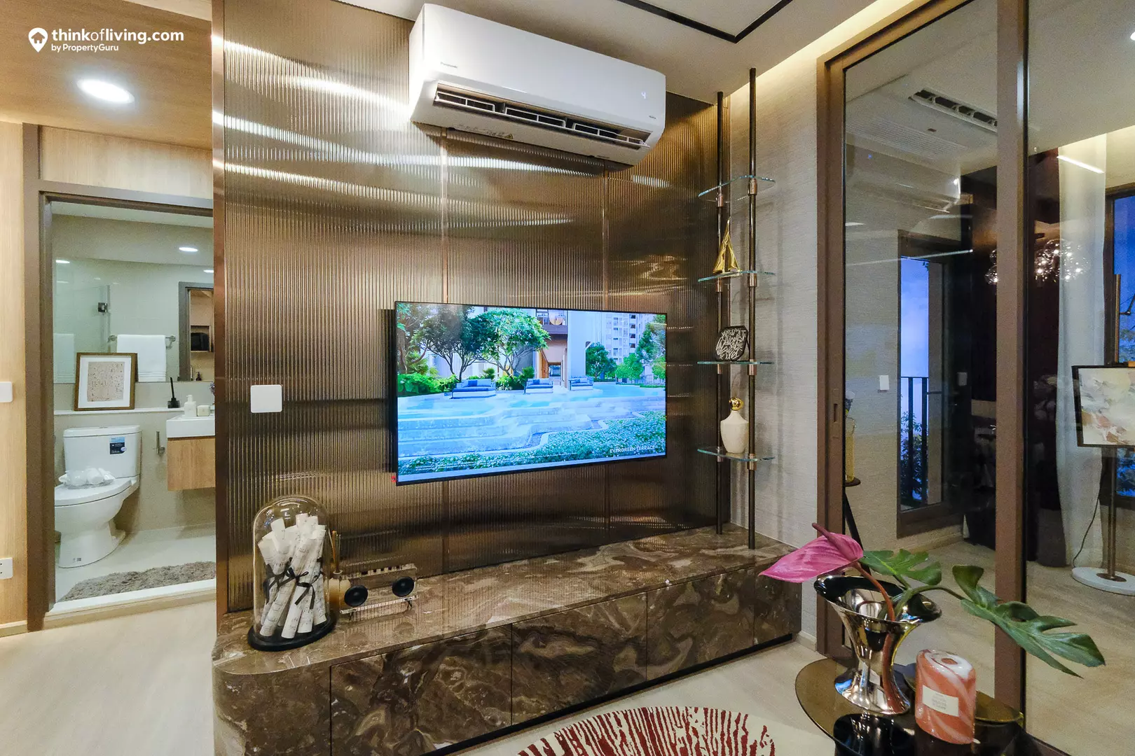 ชั้นวางทีวีจะอยู่บริเวณหน้าห้องครัวค่ะ มีพื้นที่ให้ Built-in ชั้นวางของได้แบบเต็มผนัง