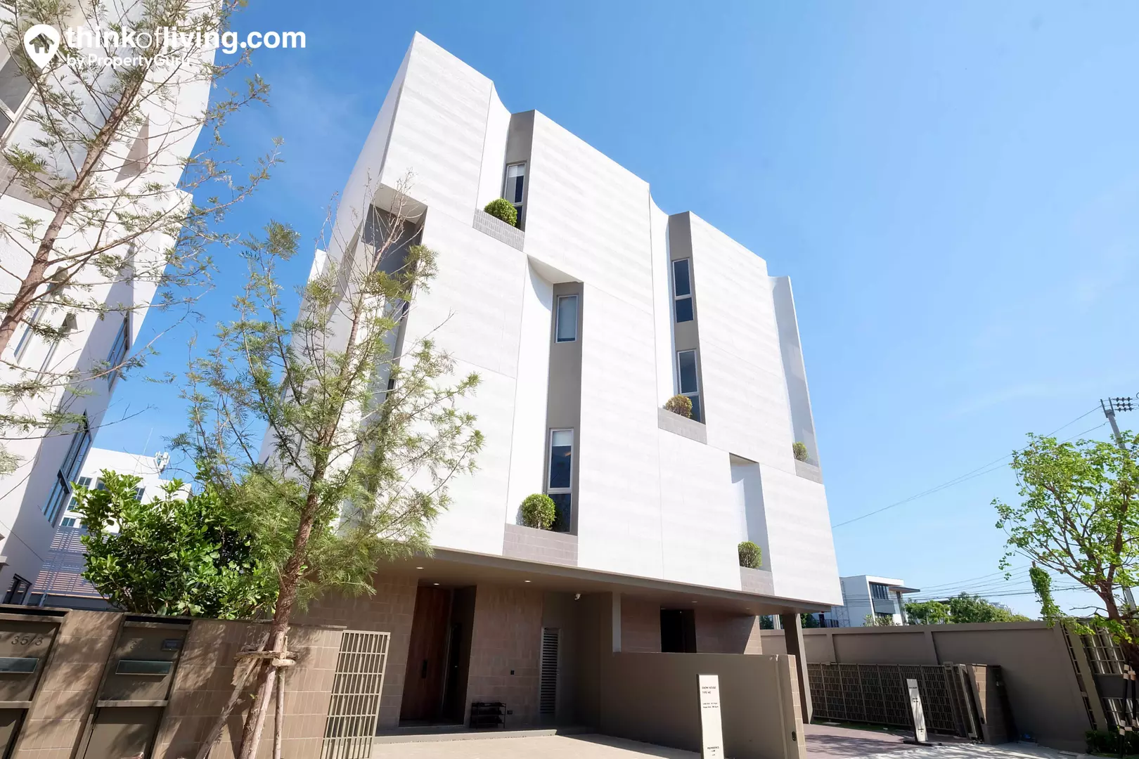 การออกแบบบ้าน : บ้านออกแบบมาในสไตล์ Modern Tropical ดูเรียบง่าย เป็นบ้านแฝด 3.5 ชั้น ได้ฟังก์ชัน 4 ห้องนอน 5 ห้องน้ำ 3 ที่จอดรถ ผนังแบบ Double Wall พร้อมฉนวนกันเสียง ทุกห้องนอนมีทั้งห้องน้ำส่วนตัว รองรับการติดตั้งลิฟต์ไฮดรอลิก เน้นพื้นที่ภายในตัวบ้าน จึงไม่มีระเบียงตามห้องต่าง ๆ ของบ้าน ทำให้ใช้พื้นที่ภายในได้เต็มที่ โครงการเพื่อนบ้านในราคาใกล้เคียงกันอาจจะดูพื้นที่ใช้สอยเยอะ เพราะมีพื้นที่ดาดฟ้ามาให้ ซึ่งบางคนอาจจะไม่ได้ขึ้นไปใช้งานบ่อย