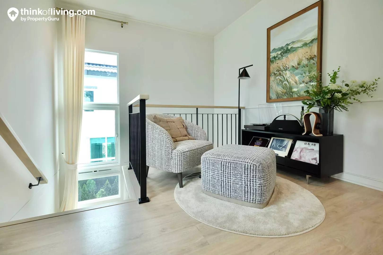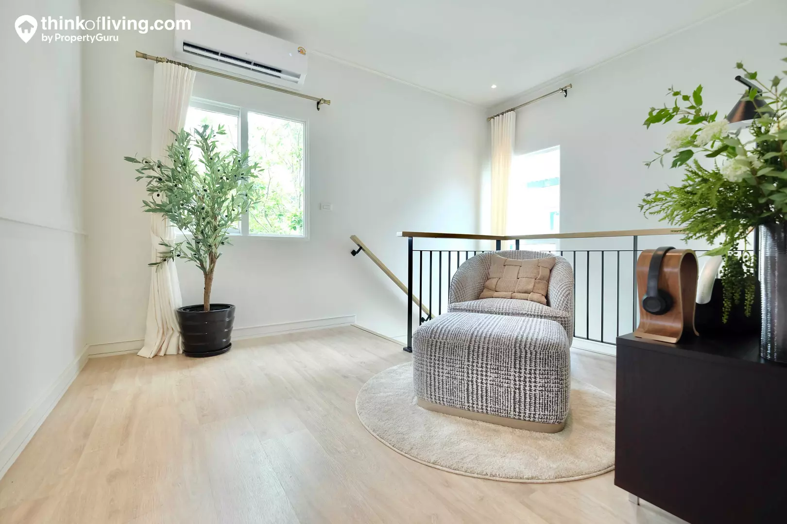 ขึ้นมาที่ชั้น 2 เราจะเจอกับพื้นที่อเนกประสงค์ สามารถจัดเป็นมุมนั่งเล่นพักผ่อนแบบบ้านตัวอย่างก็ได้ หรือใครจะจัดเป็นโซนห้องพระ โต๊ะนั่งทำงานก็สามารถทำได้ครับ ปรับเปลี่ยนได้ตามไลฟ์สไตล์ของเจ้าของบ้านเลยครับ