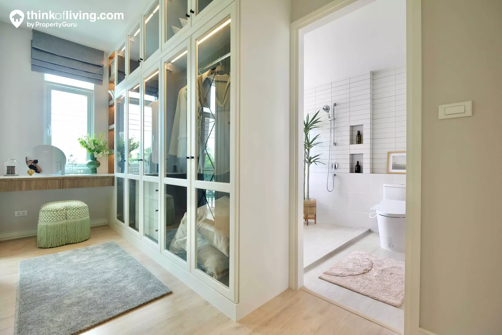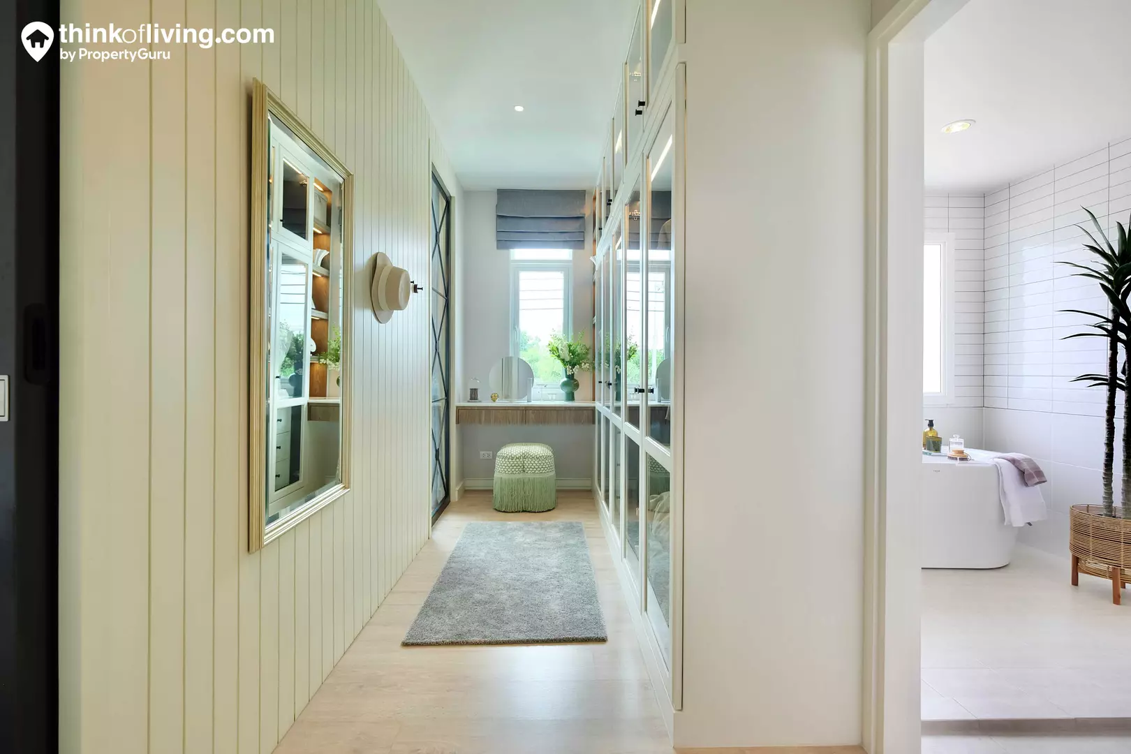 ด้านซ้ายจะมีพื้นที่ Walk-in Closet บริเวณหน้าห้องน้ำ สามารถบิ้วอินตู้ขนาดประมาณ 2.1 เมตรพร้อมโต๊ะเครื่องแป้งเข้ามุมได้