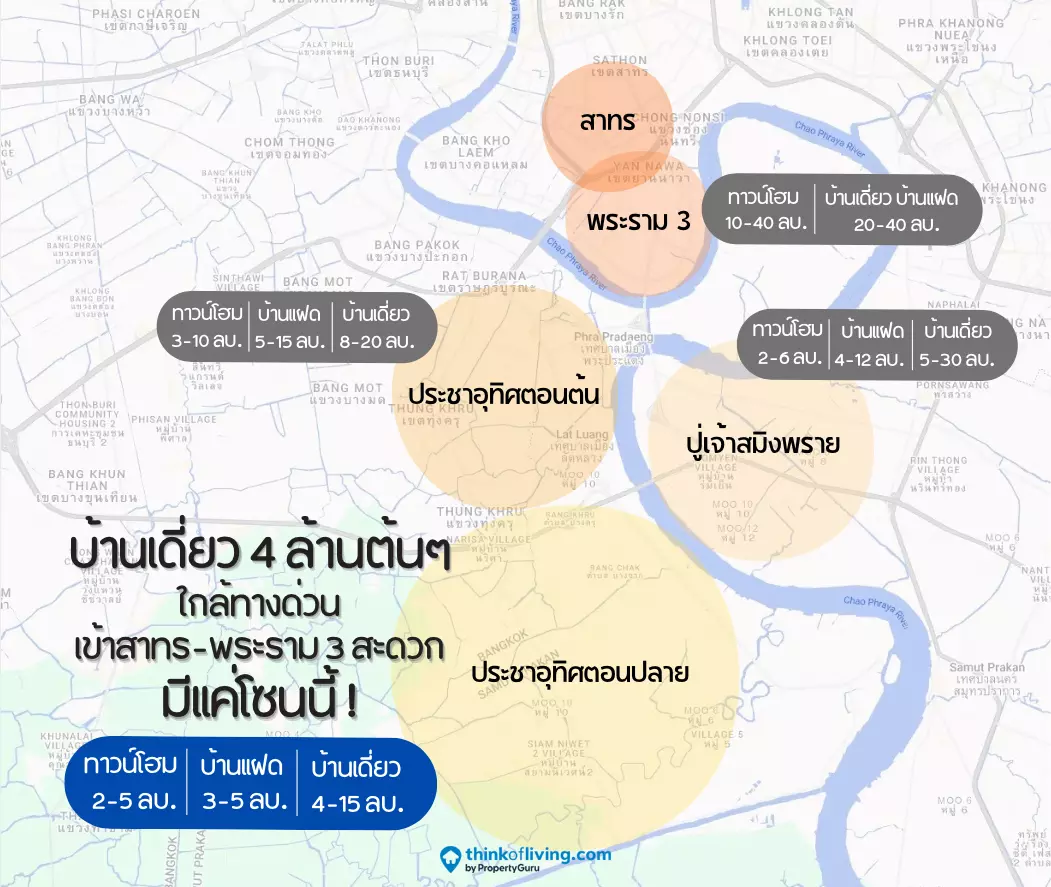 แต่ถ้าใครที่มีงบประมาณไม่ถึง 8 ล้านแล้วต้องการบ้านเดี่ยว แนะนำให้ขยับออกมาอีกหน่อยที่โซนประชาอุทิศตอนปลาย และปู่เจ้าสมิงพราย เอาจริงๆ 2 โซนนี้ราคาไม่ต่างกันมาก แต่ด้วยความที่โซนปู่เจ้าฯ มีรถไฟฟ้าวิ่งผ่าน โครงการส่วนใหญ่ที่มาเปิดจึงเป็นคอนโดมากกว่า ต่างจากโซนประชาอุทิศตอนปลายที่มีโครงการบ้านจัดสรรเปิดตัวเยอะมาก ตอนนี้ถือว่าเป็นโซนใกล้ทางด่วนให้เดินทางเข้าสาทร-พระราม 3 ได้สะดวก และมีราคาหยิบจับง่ายที่สุด ตั้งแต่ทาวน์โฮม 2 ล้านบาท ไปจนถึงบ้านเดี่ยวที่มีราคาเริ่มแค่ 4 ล้านบาทเท่านั้น แต่ก็แลกกับการยอมขยับออกมานอกเมืองหน่อย ไกลจากจุดขึ้นทางด่วนเพิ่มสัก 20 – 30 นาทีดูตามกายภาพแล้วโซนนี้น่าจะเป็นโซนใกล้พระราม 3โซนสุดท้ายที่ยังทำราคาดีๆ แบบนี้ได้นะคะ