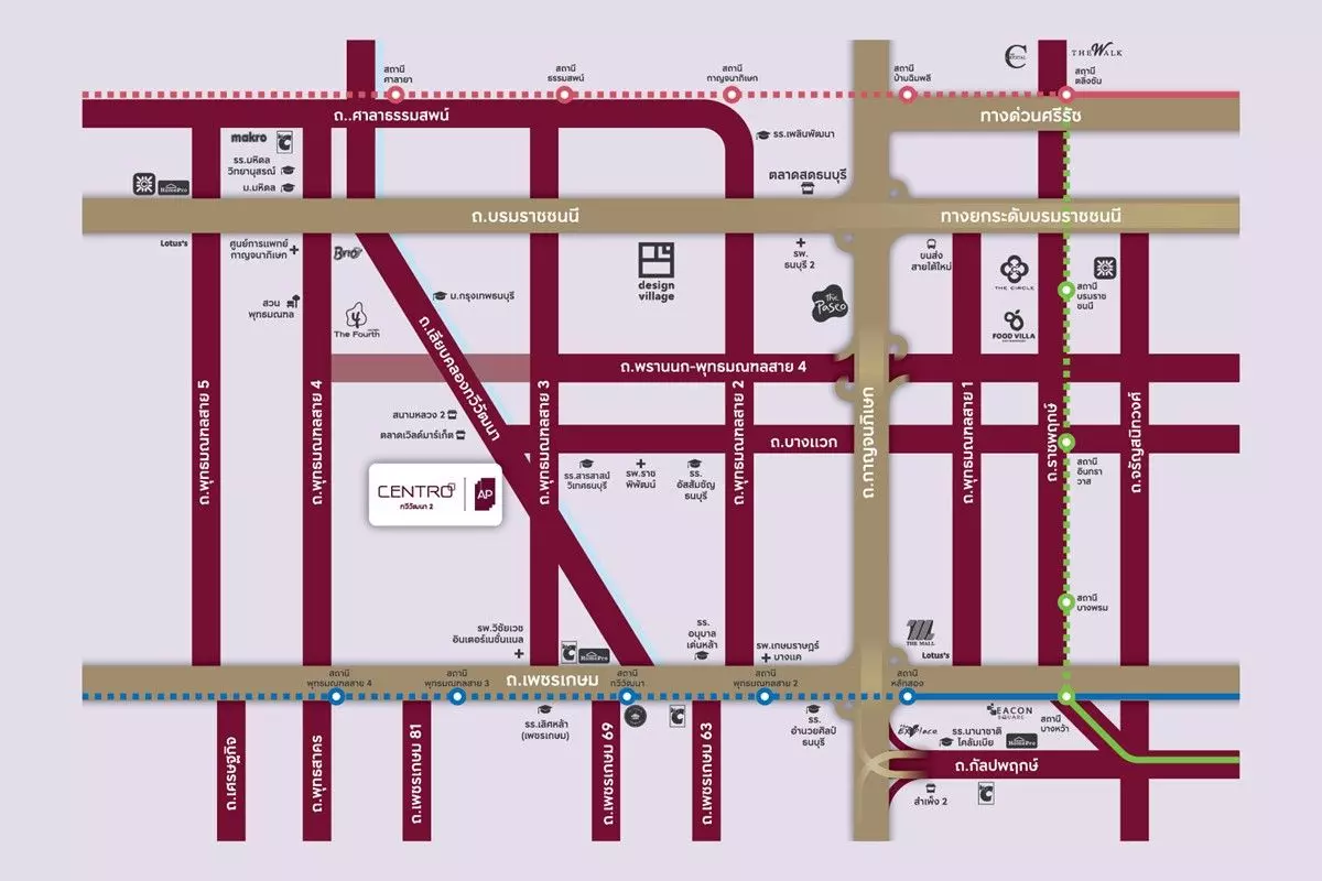 โครงการ Centro ทวีวัฒนา 2 เชื่อมต่อ 3 ถนนหลัก ถนนบรมราชชนนี ถนนเพชรเกษม และถนนกาญจนาภิเษก อีกทั้งยังใกล้โรงเรียนอัสสัมชัญธนบุรีเพียง 3.3 กิโลเมตร