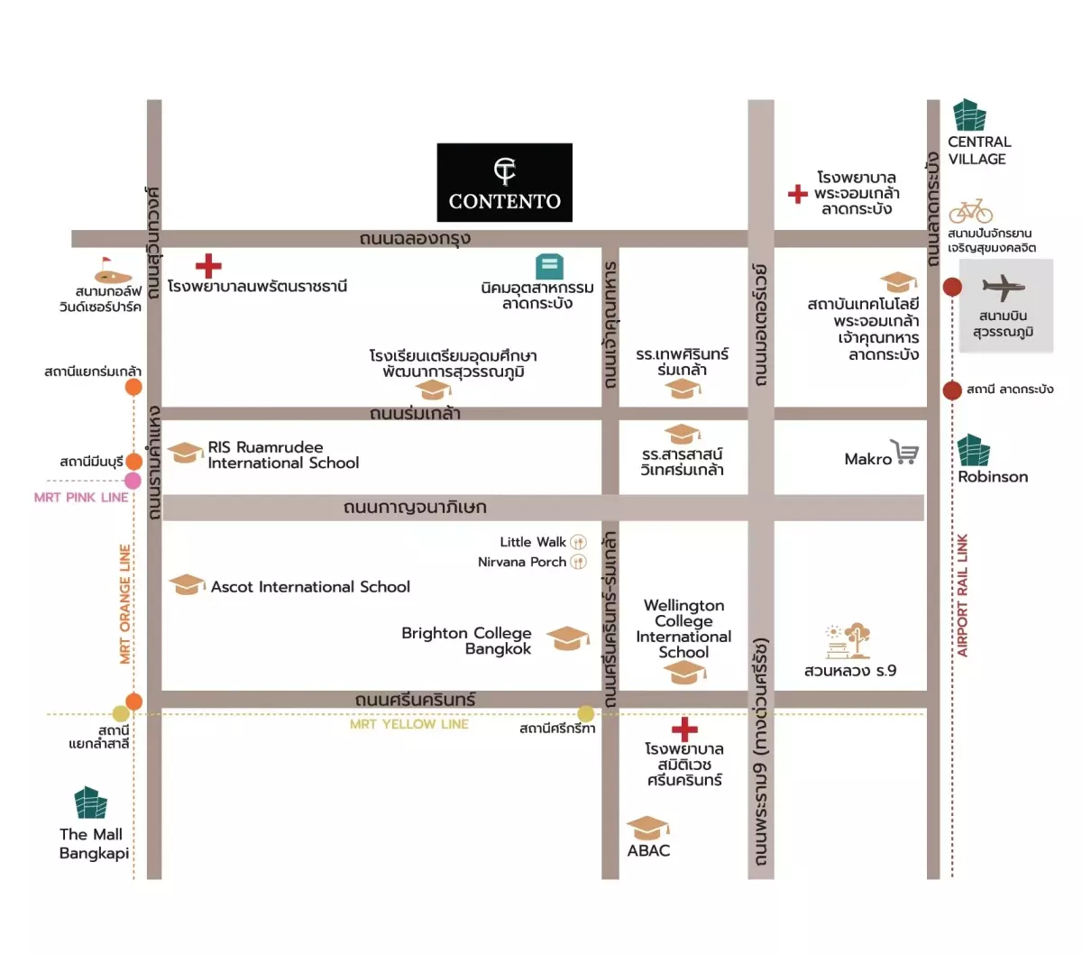 โครงการ Contento Krungthep Kreetha – Chalongkrung (คอนเตนโต กรุงเทพกรีฑา – ฉลองกรุง) ตั้งอยู่บนถนนฉลองกรุงย่านลาดกระบัง ใกล้กับสนามบินสุวรรณภูมิและมอเตอร์เวย์กรุงเทพ-ชลบุรี อีกทั้งโดยรอบก็ยังมีโรงเรียนนานาชาติและมหาวิทยาลัยตั้งอยู่ด้วยครับ