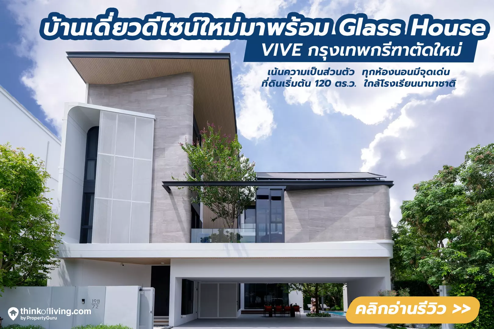 รีวิวฉบับที่ 2887 … เปิดตัวโครงการ VIVE กรุงเทพกรีฑาตัดใหม่ บ้านเดี่ยวหรู 3 ชั้นพร้อมลิฟต์ในตัวและ Glass House ในโซนศรีนครินทร์-ร่มเกล้า จาก Land & Houses ทำเลใกล้โรงเรียนนานาชาติ Ascot Bangkok เพียง 2-3 กิโลเมตร ผู้ปกครองไปรับ-ส่งได้สบายๆ ตัวบ้านได้ฟังก์ชัน 4 ห้องนอน 6 ห้องน้ำ 4 ที่จอดรถ 1 Glass House และ 1 ห้องแม่บ้าน บนที่ดินเริ่มต้น 120 ตารางวา ในราคาเริ่มต้น 68 ล้านบาท สำหรับ Highlights ที่น่าสนใจจะมีอะไรบ้าง ไปชมกันเลย