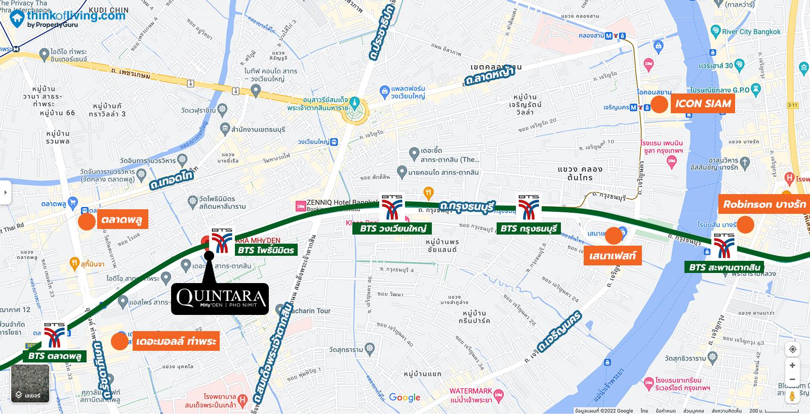 ส่วนที่ตั้งของโครงการ ควินทารา มาย’เดน โพธิ์นิมิตร (Quintara MHy’DEN Pho Nimit) จะอยู่ติดกับรถไฟฟ้า BTS สถานีโพธิ์นิมิตร ซึ่งอยู่ระหว่างสถานีวงเวียนใหญ่และสถานีตลาดพลูที่บอกไป สถานีนี้ในแง่ความอุดมสมบูรณ์ ร้านอาหาร ตลาดจะมีไม่มากนัก แต่ร้านอาหารใน Grab เพียบเพราะสถานีข้างๆ มีร้านค้าเยอะมาก เป็นสถานีเงียบๆ ที่ไม่มีคอนโดมาเปิดเท่าไหร่ แต่ก็จะมีข้อดีอยู่ที่ 1) ได้ความสงบ 2) ราคาที่ต่ำกว่าคอนโดสถานีข้างเคียง 3) เป็นโครงการเพิ่งสร้างเสร็จใหม่ที่ติดรถไฟฟ้า ออกจากหน้าโครงการก็เจอทางขึ้นลงสถานีเลยค่ะ