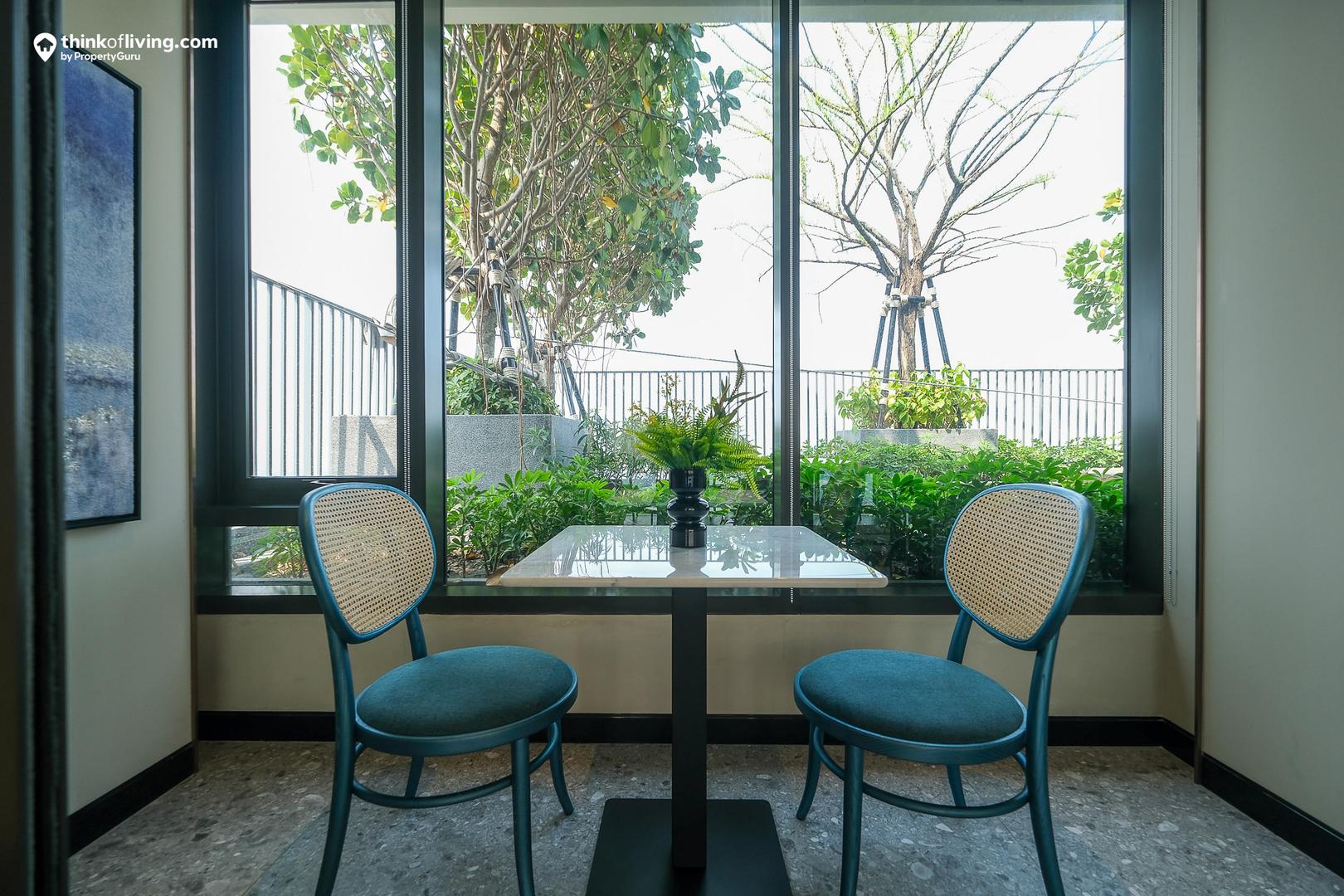 ในห้องตัวอย่างจะจัดชุดโต๊ะกินข้าวมาให้ดูแบบ 2 ที่นั่ง ดูแล้วมีระยะโดยรอบค่อนข้างดี ถอยเก้าอี้เข้า-ออก ใช้งานสบาย ไม่เบียดค่ะ