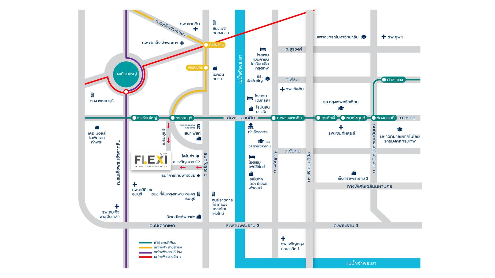 แผนที่จากทางโครงการ จะเห็นว่า FLEXI สาทร – เจริญนคร ตั้งอยู่ในซอยเจริญนคร 22 ใกล้กับถนนเจริญนคร ซึ่งถนนเจริญนครจัดเป็นถนนเส้นหลักที่สามารถไปเชื่อมต่อกับถนนได้อีกหลายสาย ใกล้ที่สุดคือถนนกรุงธนบุรีที่ขับไปฝั่งสีลม – สาทร เข้า – ออกเมืองได้อย่างสะดวก หรือไป ICON SIAM เชื่อมต่อไปฝั่งวงเวียนใหญ่ได้ หรือขับไปจนสุดก็สามารถใช้สะพานพระปกเกล้าข้ามไปฝั่งสำเพ็ง พาหุรัดได้ค่ะ