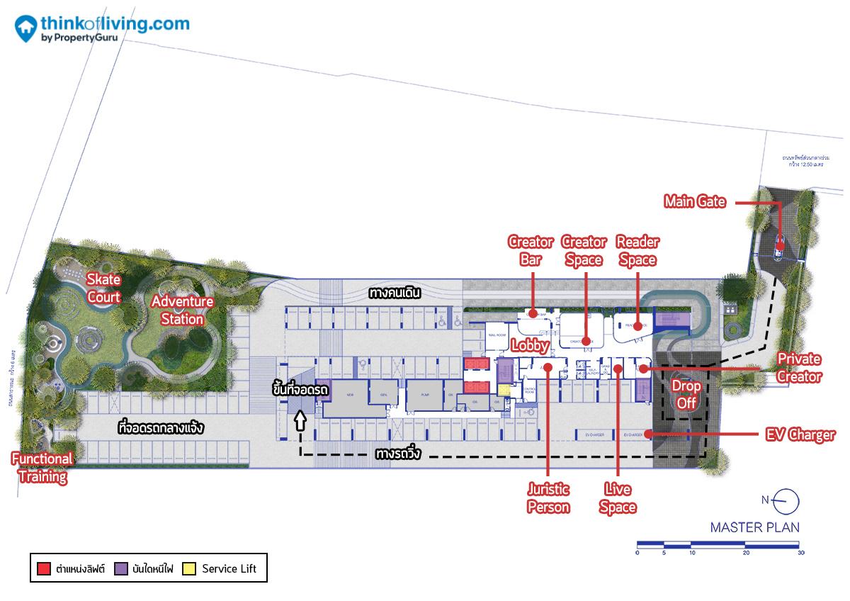 เรามาเริ่มกันที่ Master Plan โครงการกันเลย ทางโครงการออกแบบบริเวณชั้น 1 เป็นพื้นที่ส่วนกลางและที่จอดรถ แต่ดีที่แบ่งโซนแยกกันชัดเจน โดยจะมีพื้นที่จอดรถจะอยู่ด้านหลังอาคาร สำหรับฟังก์ชันส่วนกลางในชั้น 1 จะแบ่งออกเป็น 2 โซน ได้แก่ Creator Zone จะเป็นพื้นที่ Indoor ภายในอาคาร เน้นเป็นพื้นที่นั่งเล่นพักผ่อนและทำงานอ่านหนังสือได้นั่นเอง ส่วนโซน Adventure Zone จะเป็นฟังก์ชัน Outdoor บริเวณด้านหลังโครงการ ให้มาเดินเล่นหรือทำกิจกรรมร่วมกับเพื่อนๆได้