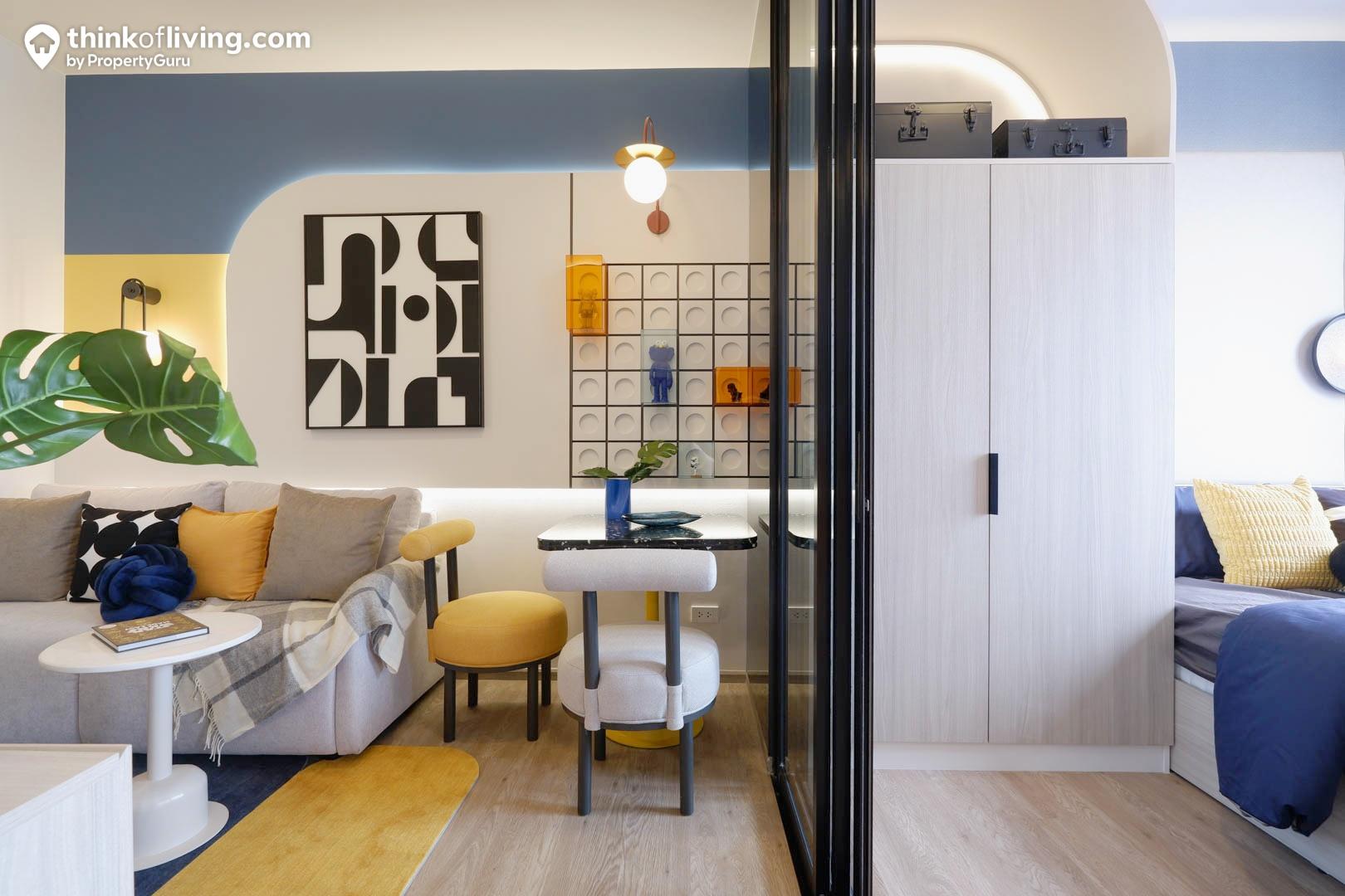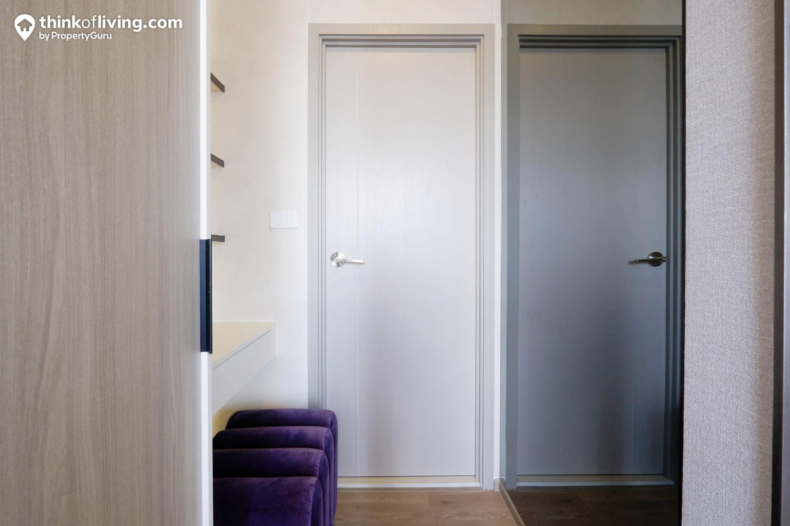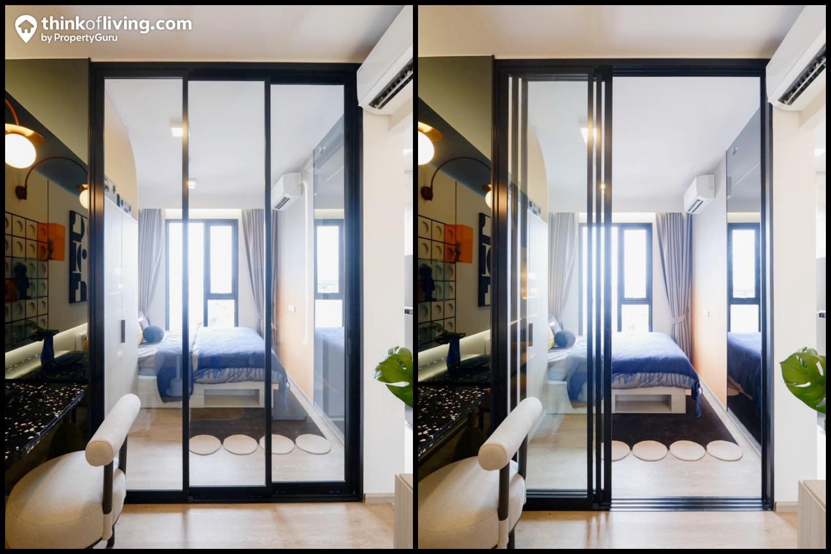 ทางโครงการเลือกใช้ประตูกระจกบานเลื่อน 3 ตอนกั้นระหว่าง Common Area และห้องนอน ทำให้สามารถเปิด-ปิดได้กว้าง กั้นฟังก์ชันเป็นสัดส่วนและได้แสงสว่างจากด้านนอกเข้ามาภายในห้องด้วย ซึ่งเราแนะนำให้ติดผ้าม่านเพิ่มตรงประตูนี้ด้วยนะ เวลามีแขกหรือเพื่อนมาเยี่ยมก็สามารถปิดผ้าม่านบังสายตาไม่ให้เห็นห้องนอนที่เป็นพื้นที่ส่วนตัวของเราได้ค่ะ