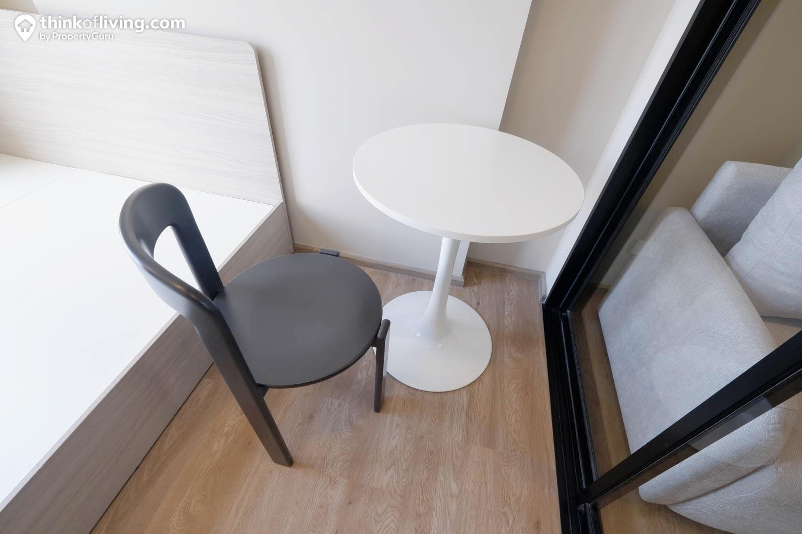 บริเวณข้างเตียงจะมีพื้นที่อเนกประสงค์อยู่ ซึ่งทางโครงการจะให้โต๊ะและเก้าอี้มา 1 ตัว เหมือนภาพด้านบนให้เราใช้เป็นมุมโต๊ะทำงานหรือโต๊ะแต่งหน้าได้ แต่เรามองว่าไม่เหมาะเป็นโต๊ะกินข้าวนะ เพราะอยู่ไกลครัว อีกทั้งยังอยู่ใกล้กับเตียง จึงเสี่ยงมีมดหรือแมลงต่างๆได้