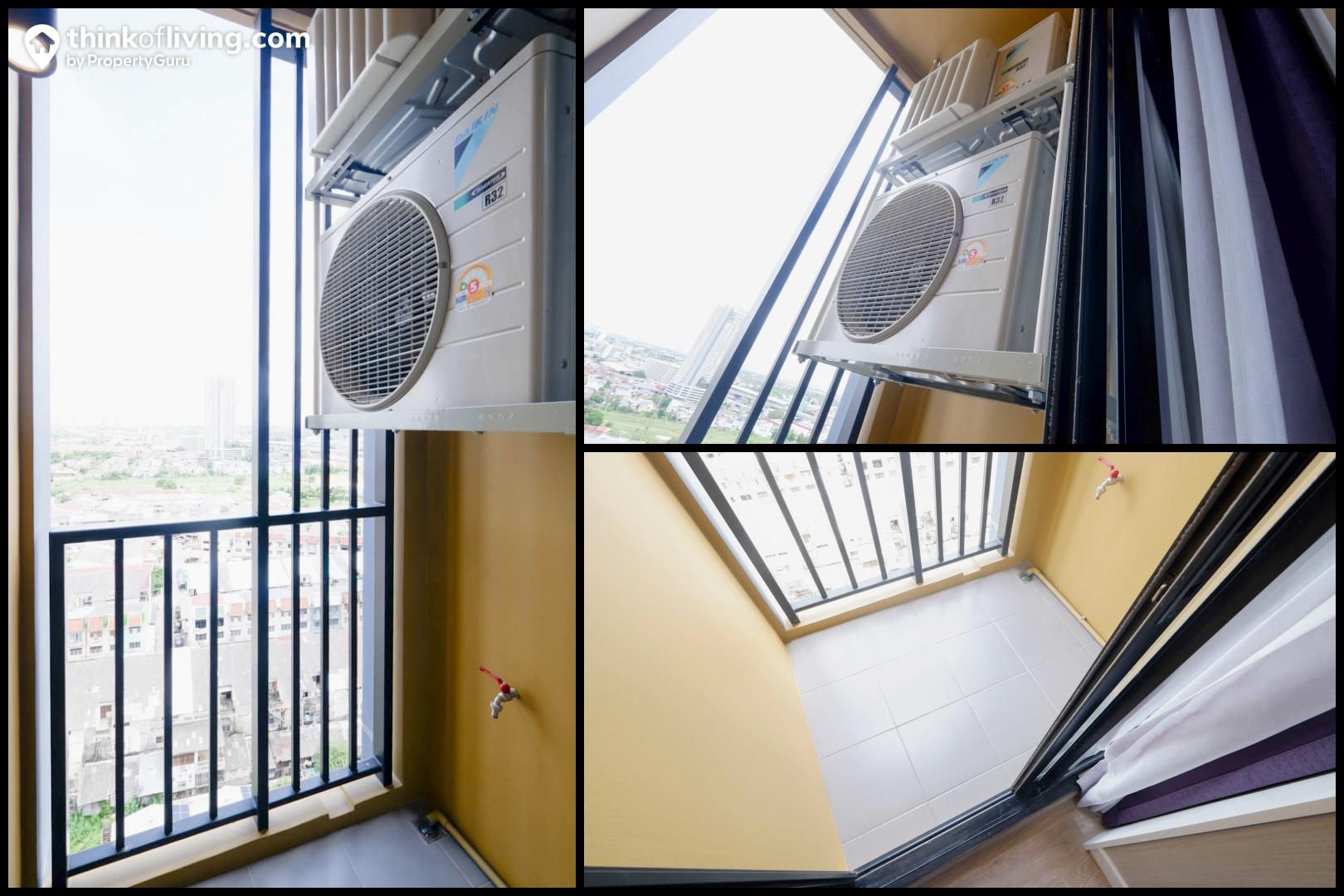 - ระเบียง มีพื้นที่ด้านล่างใช้งานได้ เพราะแขวน Condensing Unit ไว้ด้านบน