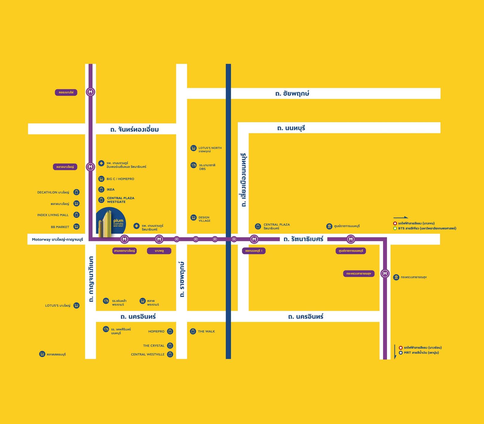 โครงการ Plum Condo New West (พลัมคอนโด นิวเวสต์) เป็นคอนโด High Rise ที่มีทางเข้า-ออกอยู่ติดถนนรัตนาธิเบศร์และอยู่บริเวณสามแยกบางใหญ่ ซึ่งเป็นศูนย์กลางความคึกคักและความอุดมสมบูรณ์ของย่านบางใหญ่นี้เลย เพราะมีห้างใหญ่อย่าง Central Westgate และ IKEA บางใหญ่นั่นเอง นี่จึงเป็น Highlight สำคัญของโครงการนี้ที่โครงการเพื่อนบ้านสู้ไม่ได้ เรียกว่ารั้วโครงการอยู่ติดกับ Central Westgate และ IKEA บางใหญ่ เลยค่ะ