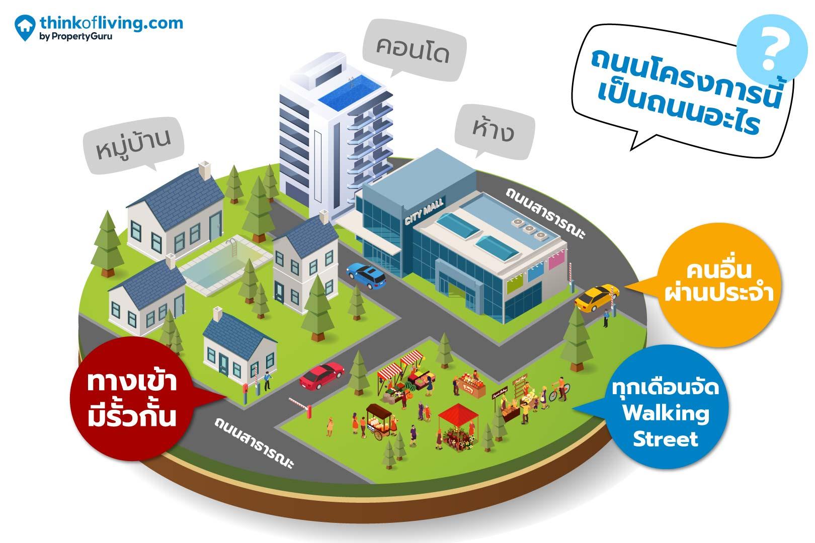 อย่างเวลาไปรีวิวโครงการต่างๆ ทางทีม Think of Living ก็จะเป็นตัวแทนทุกคน คอยเช็กกับโครงการโดยตรงเสมอว่าถนนด้านหน้าหรือรอบข้างหมู่บ้านเหล่านี้ เป็นถนนอะไรกันแน่ เพื่อให้ได้ข้อมูลที่ถูกต้องและช่วยป้องกันไม่ให้ทุกคนต้องเสียสิทธิ์การใช้งานถนนในภายหลังค่ะ
