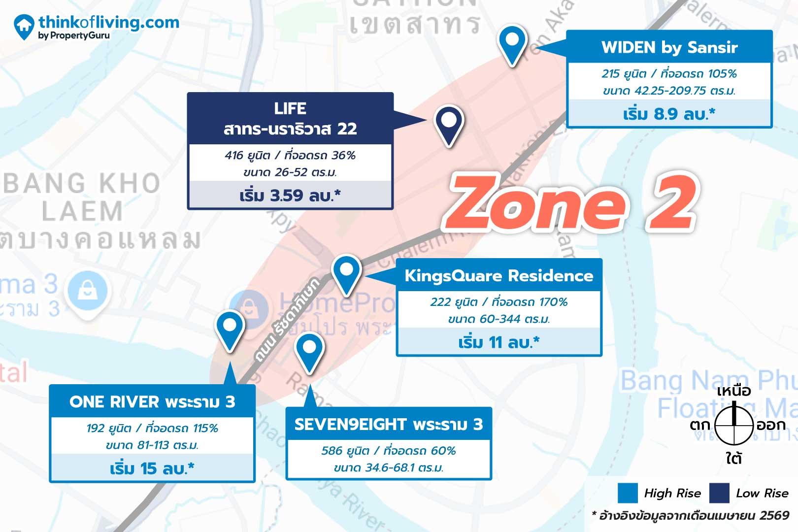 สำหรับบทความนี้ เราจะขอแบ่งคอนโดพระราม 3 ออกเป็น 3 โซนด้วยกัน ดังนี้