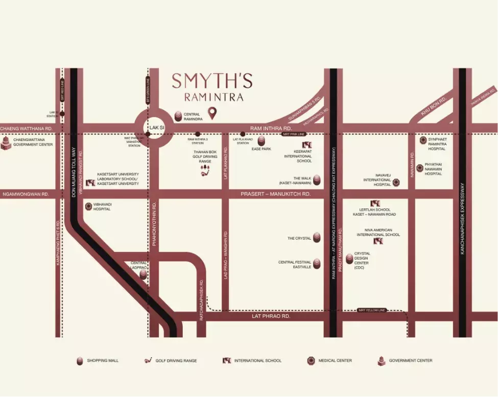 ทำเลของโครงการ SMYTH’S RAMINTRA (สมิทธ์ รามอินทรา) ตั้งอยู่บนถนนใหญ่รามอินทรา ใกล้ๆ Central รามอินทราเลย ถือเป็นทำเลที่มีศักยภาพในการอยู่อาศัย ใกล้สิ่งอำนวยความสะดวก แหล่งช้อปปิ้ง ร้านอาหาร ใกล้สุดจะเป็นเซ็นทรัล รามอินทรา ที่มีระยะห่างจากโครงการเพียง 700 เมตรค่ะ
