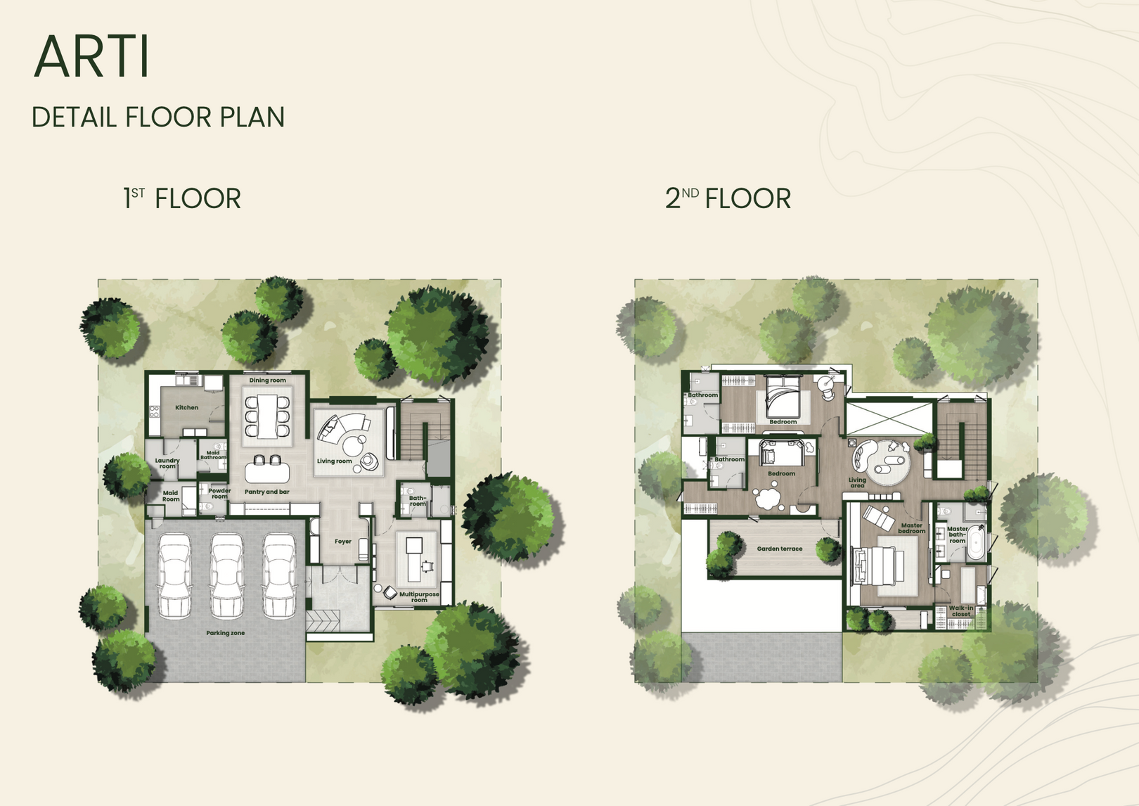 สำหรับแบบบ้านหลังเล็กสุดของโครงการและมีจำนวนยูนิตเยอะสุด ได้แก่ ARTI บ้านเดี่ยว 2 ชั้น ที่ดินเริ่มต้น 100-139 ตร.ว. พื้นที่ใช้สอย 335.5 ตร.ม. ฟังก์ชัน 3 ห้องนอน / 4 ห้องน้ำ / 1 Powder Room / 3 ที่จอดรถ / 1 ห้องอเนกประสงค์ / 2 ห้องนั่งเล่น / ครัวไทย / 1 ห้องแม่บ้าน
