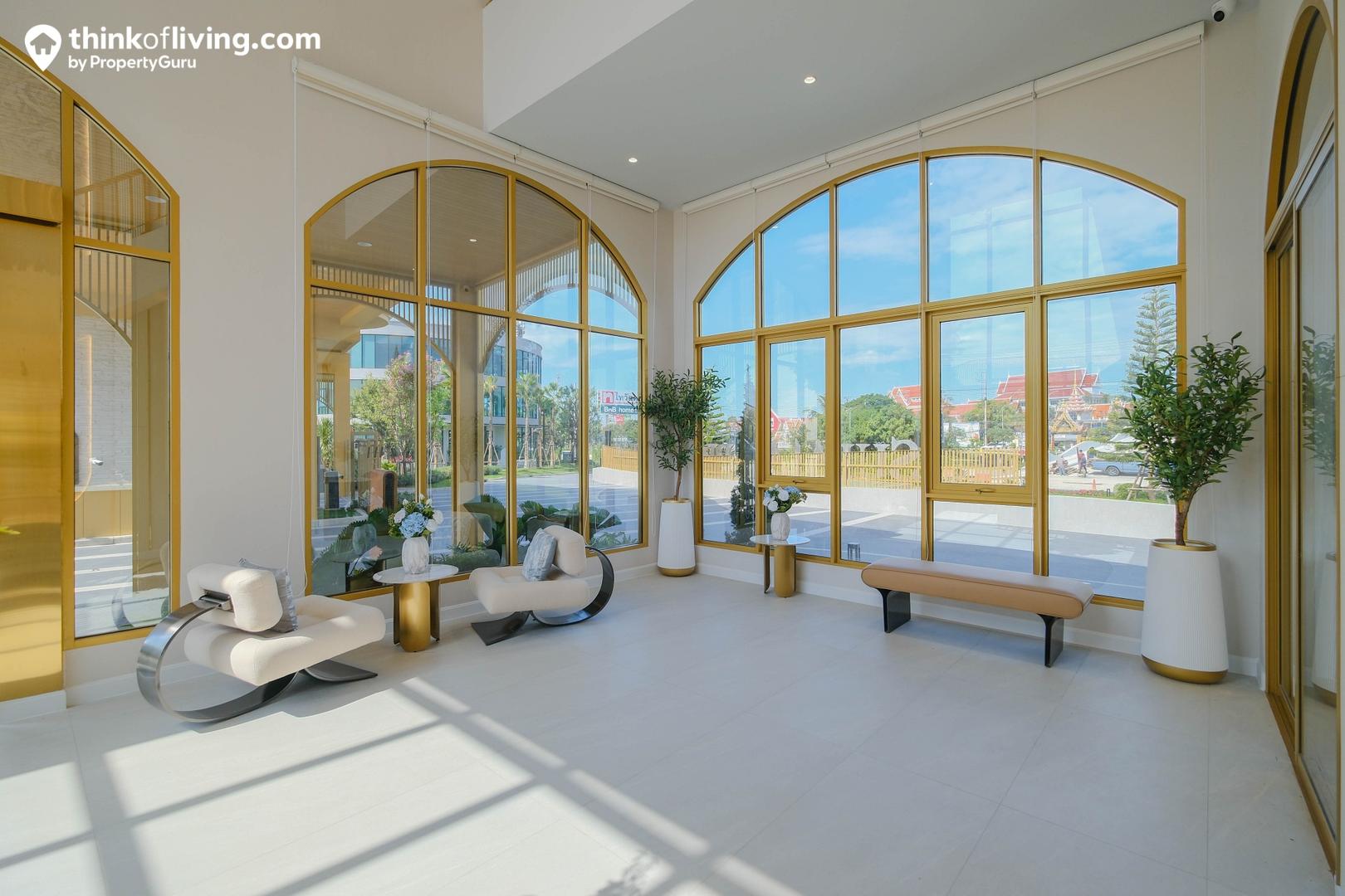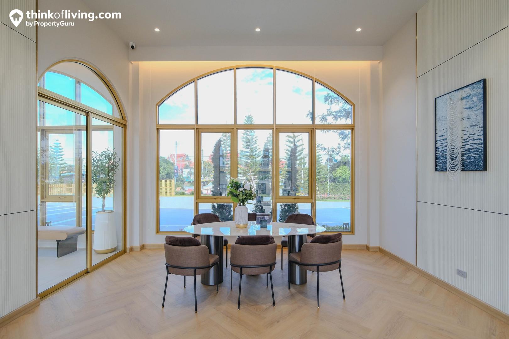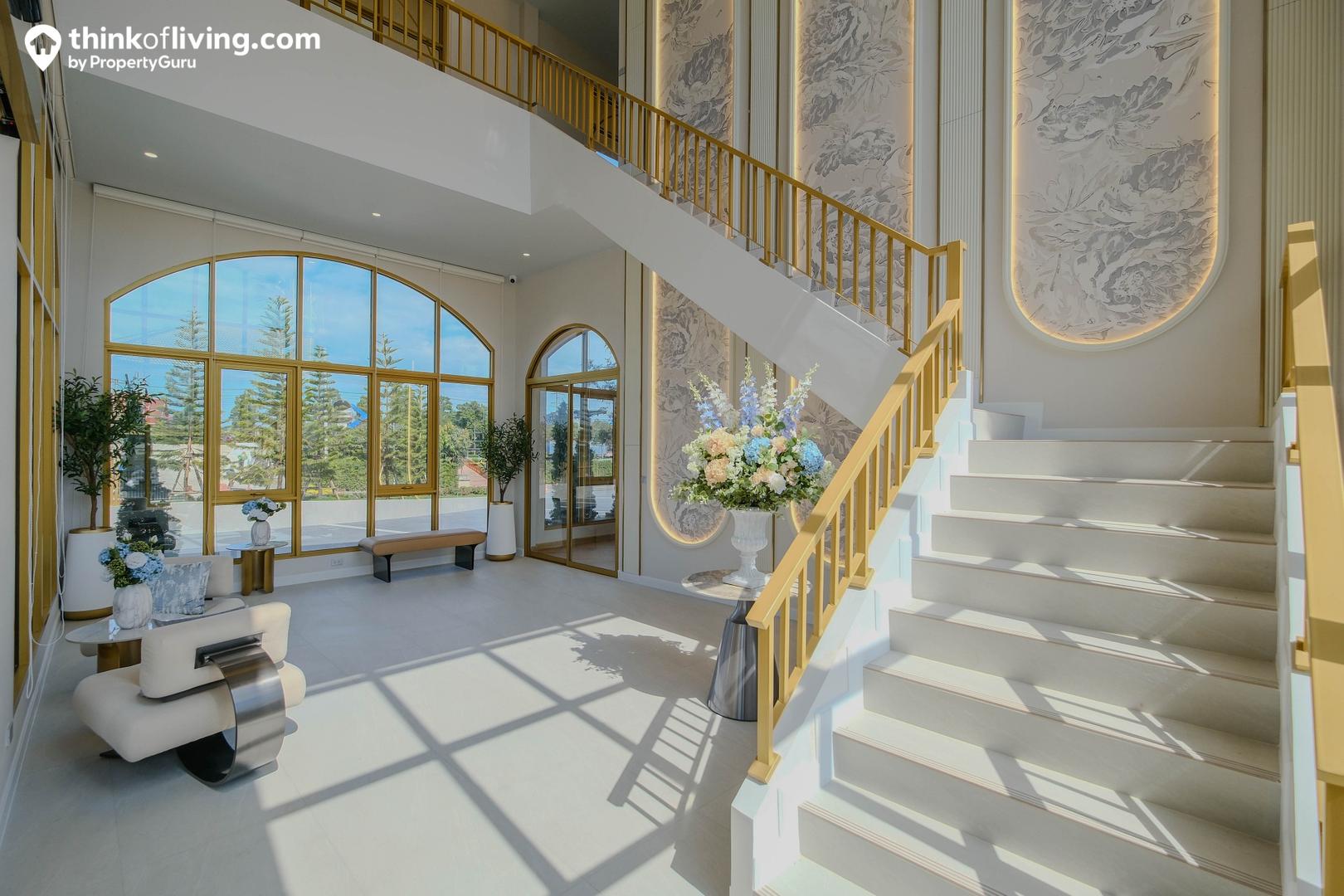 ชั้น 1 ของ Clubhouse เมื่อเข้ามาจะเป็นเหมือน Lobby ต้อนรับ ใช้เป็นโซนนั่งพักคอย หรือจุดนัดพบกับแขกภายนอกได้ บรรยากาศด้านในดูโปร่งโล่งด้วยโถงเพดานสูง มีบันไดเชื่อมต่อขึ้นไปยังชั้น 2 หน้าต่างด้านข้างได้มาไซส์ใหญ่ กรอบบานสีทอง ออกแบบเป็นทรงโค้งให้ความรู้สึกร่วมสมัย