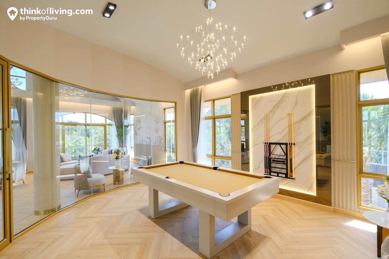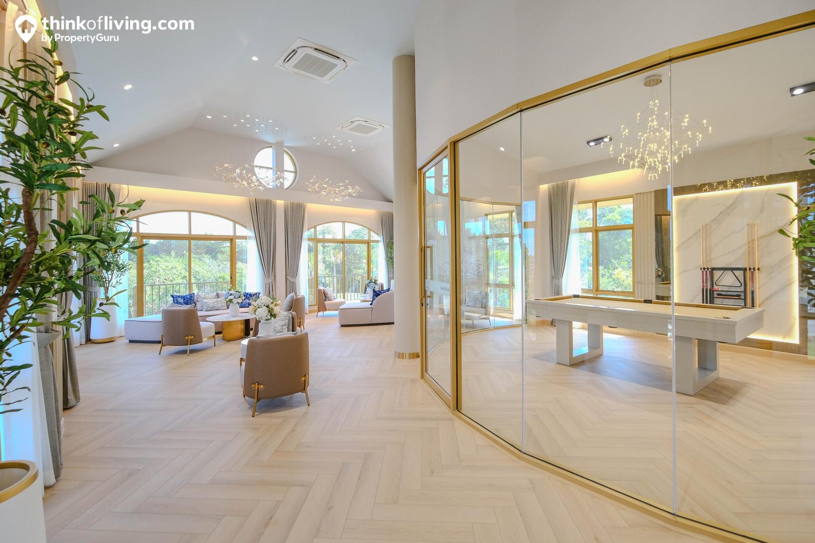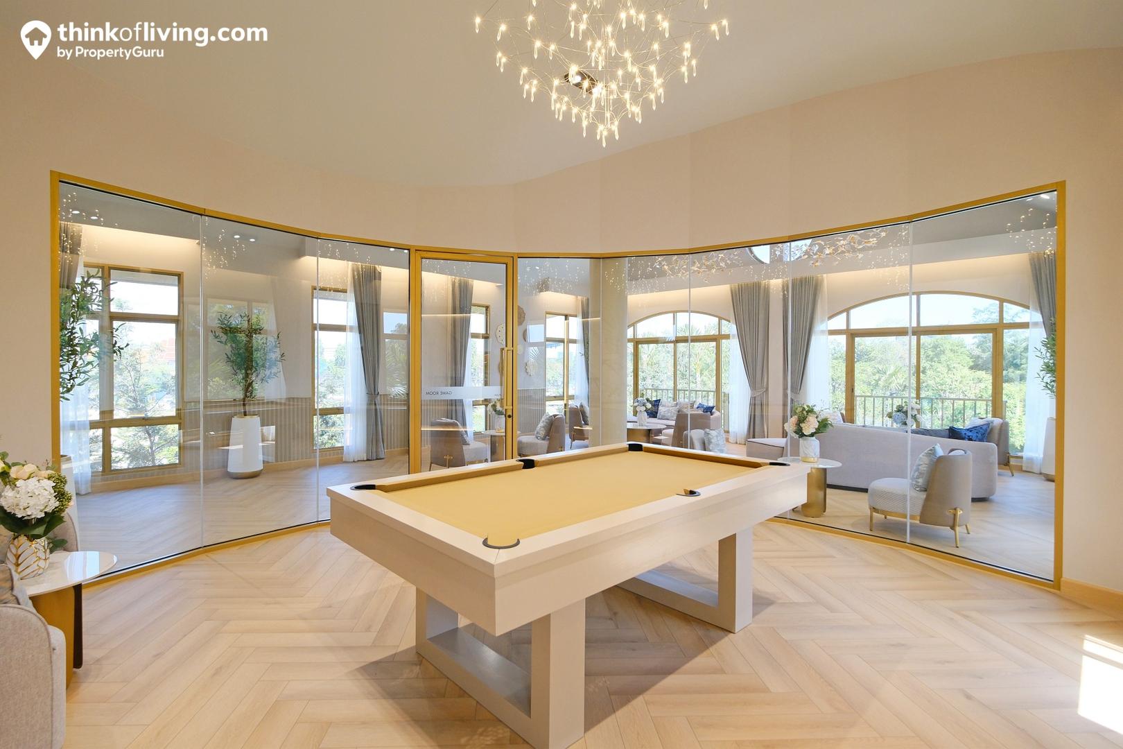 ด้านในมีห้องกระจกล้อมเป็นผนังโค้ง ช่วยเปิดมุมมองให้ดูแปลกใหม่และโปร่งโล่ง ตรงกลางวางโต๊ะบิลเลียด จัดเป็นมุมสันทนาการให้ลูกบ้านสามารถชวนเพื่อนๆมาเล่นสนุกด้วยกันได้
