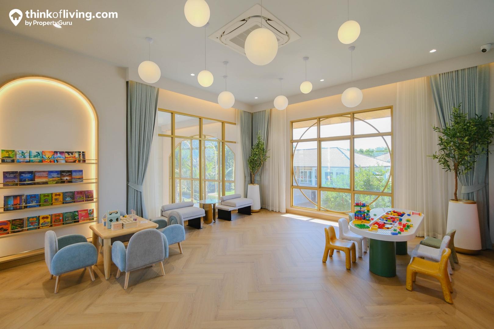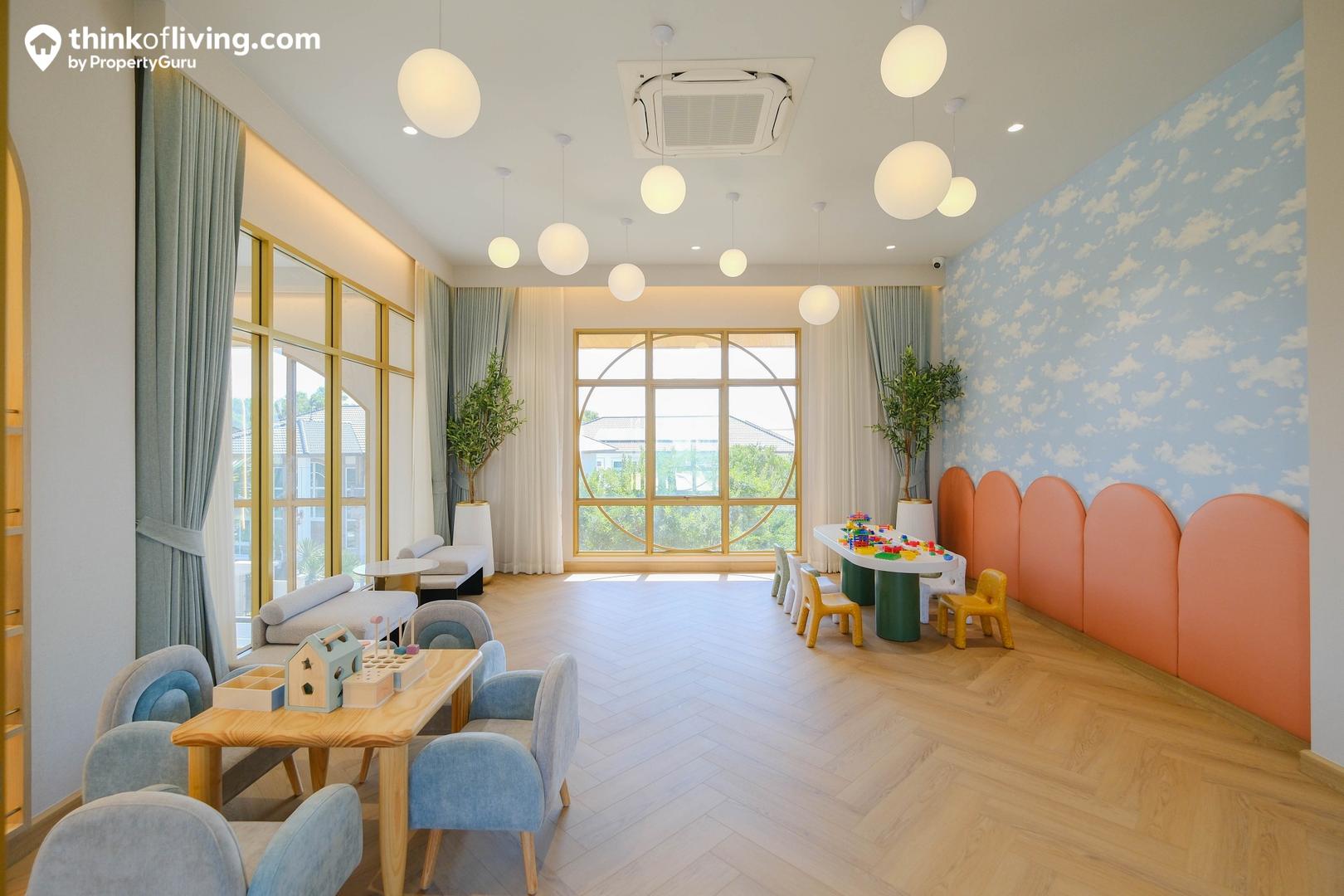 ถัดมาอีกฝั่งเป็น Kid Room ตกแต่งมาด้วยโทนสีน่ารักดูสบายตา ภายในวางชุดโต๊ะเก้าอี้จิ๋วมาให้หลายจุด ใช้เป็นมุมนั่งเล่น อ่านหนังสือกับเพื่อนๆวัยเดียวกันได้ ถือเป็นห้องที่ช่วยเสริมสร้างพัฒนาการและการเข้าสังคมของเด็กๆได้ดี