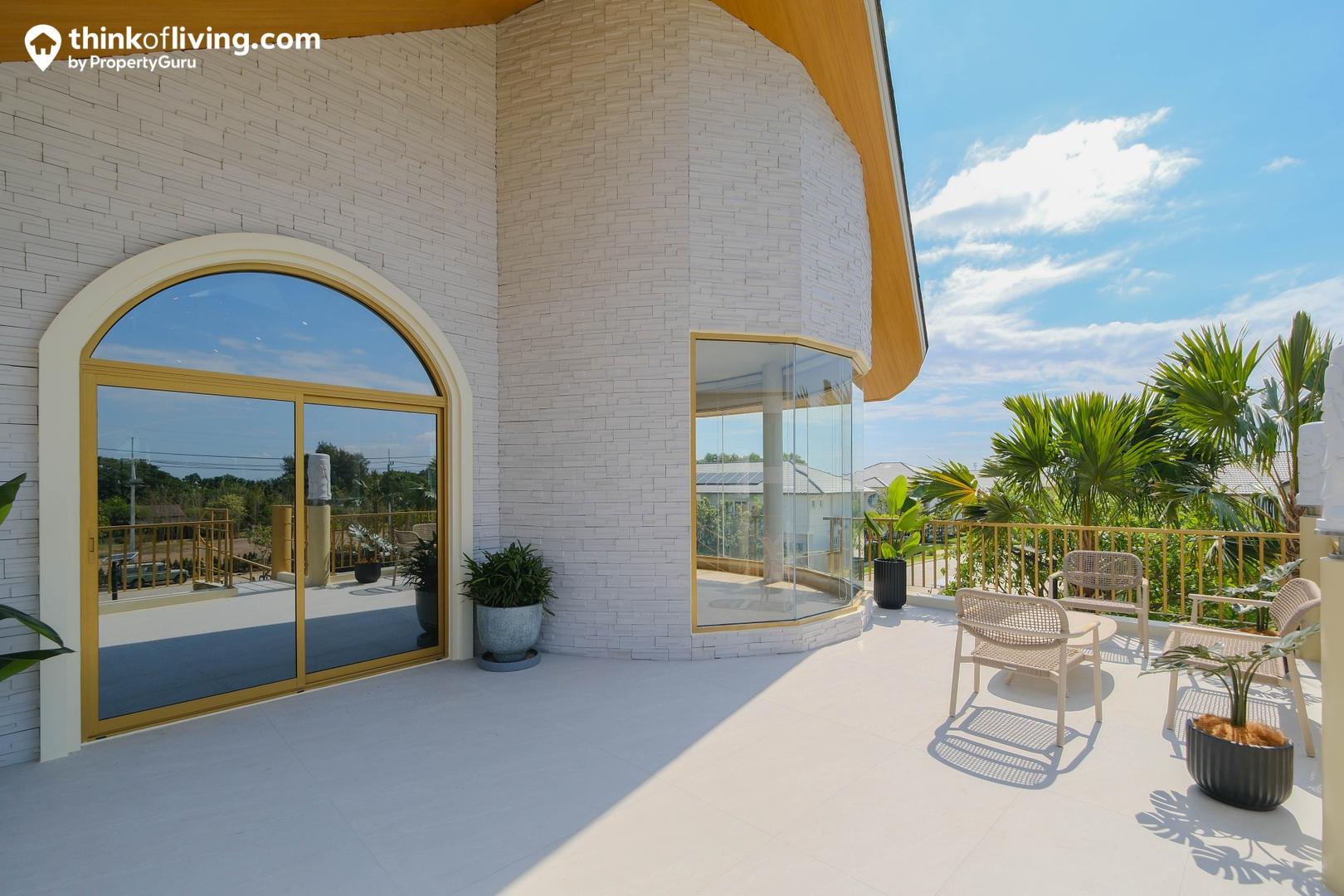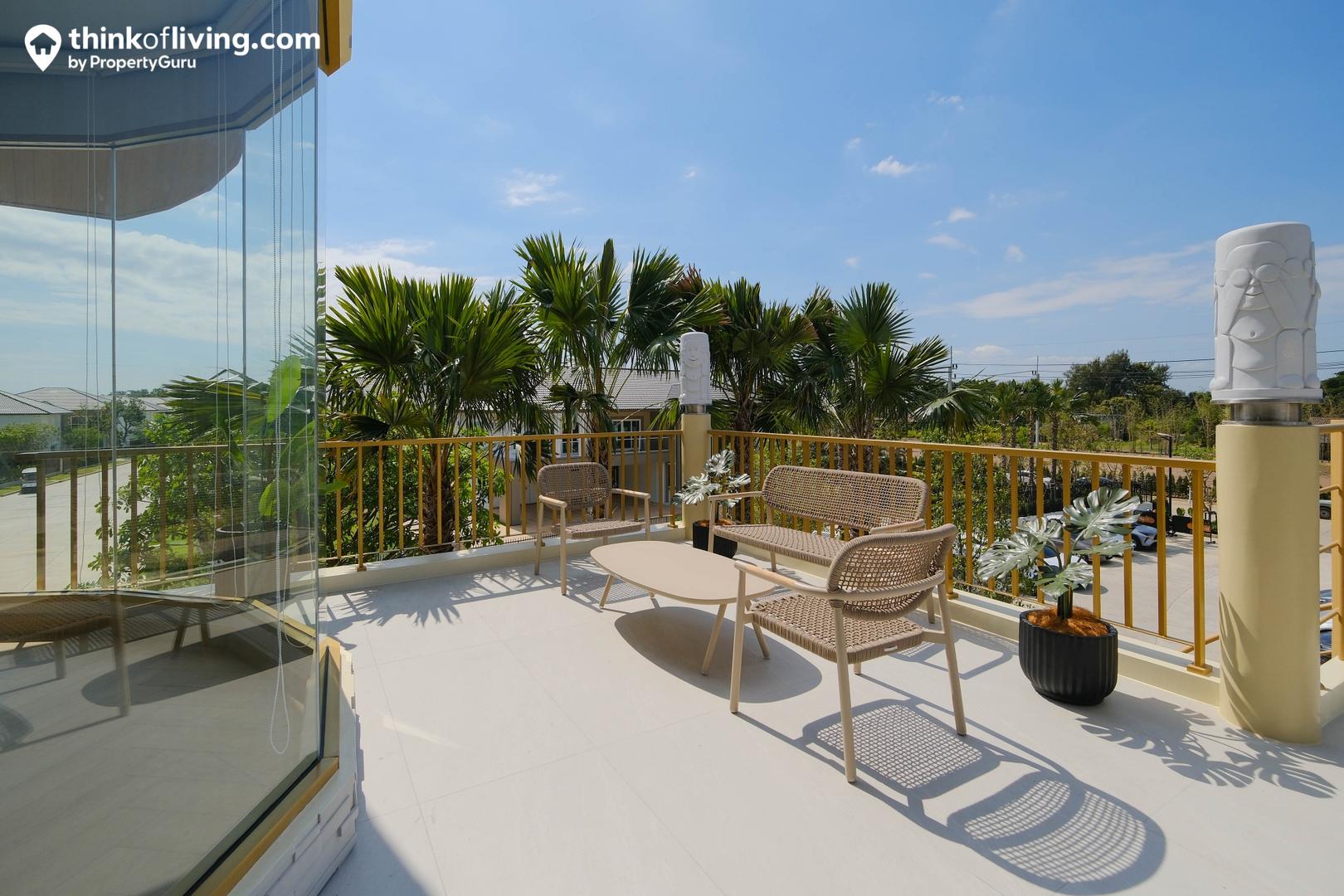 เดินตรงออกมามีระเบียงด้านนอกขนาดใหญ่ มีมุมให้นั่งพักผ่อน สำหรับใครที่อยากเปลี่ยนบรรยากาศ ออกมายืดเส้นยืดสายข้างนอก โดยด้านข้างยังมีบันไดวนเชื่อมต่อลงไปชั้น 1 ได้