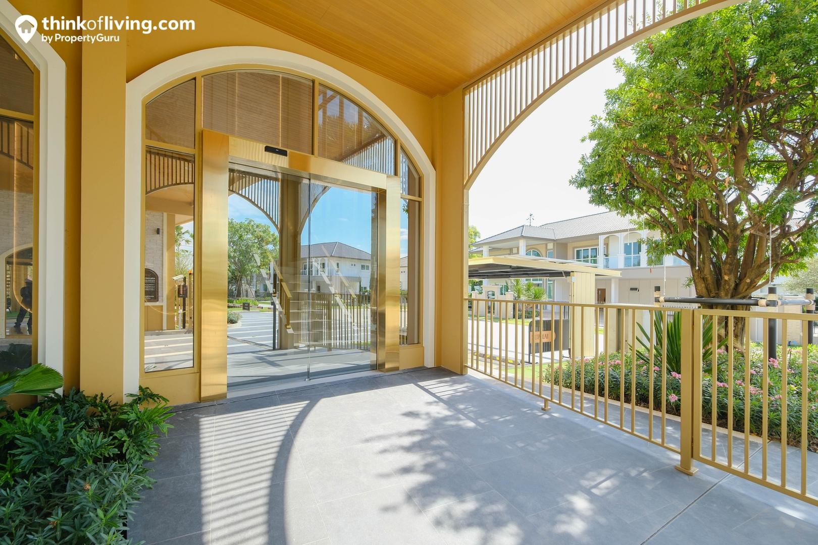 เข้ามาชมบรรยากาศภายในโครงการกันค่ะ จากซุ้มประตูด้านหน้าจะเห็นว่าออกแบบมาได้โอ่อ่า ดูโดดเด่นพอสมควรเลย โทนสีหลักที่ใช้เป็นน้ำตาล – ทอง ช่วยเพิ่ม Gimmick ให้กับโครงการ จากถนนรังสิต – นครนายกมีถนนเลี้ยวเข้าไปที่ซุ้มประตู เรามองว่าช่วยเพิ่มความปลอดภัยและความสะดวกในการเข้า – ออกได้ดี ด้านหน้าตกแต่งด้วยพื้นที่สีเขียว ทำให้ดูร่มรื่น สบายตามากขึ้น