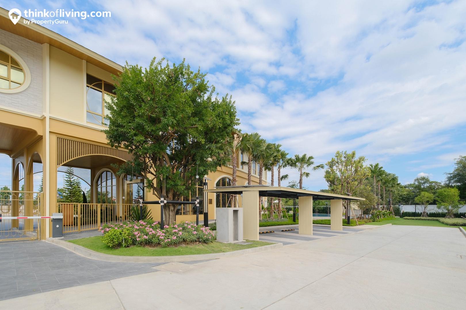 ทางเข้า Clubhouse จะอยู่บริเวณด้านข้าง สำหรับแขกภายนอกที่ขับรถมา ก็มีที่จอดอยู่ด้านหลังรองรับอยู่ด้วย รอบๆตกแต่งด้วยแนวต้นไม้และพุ่มไม้หลายจุด ได้บรรยากาศพื้นที่พักผ่อนที่ดูร่มรื่น ผ่อนคลายสไตล์รีสอร์ท