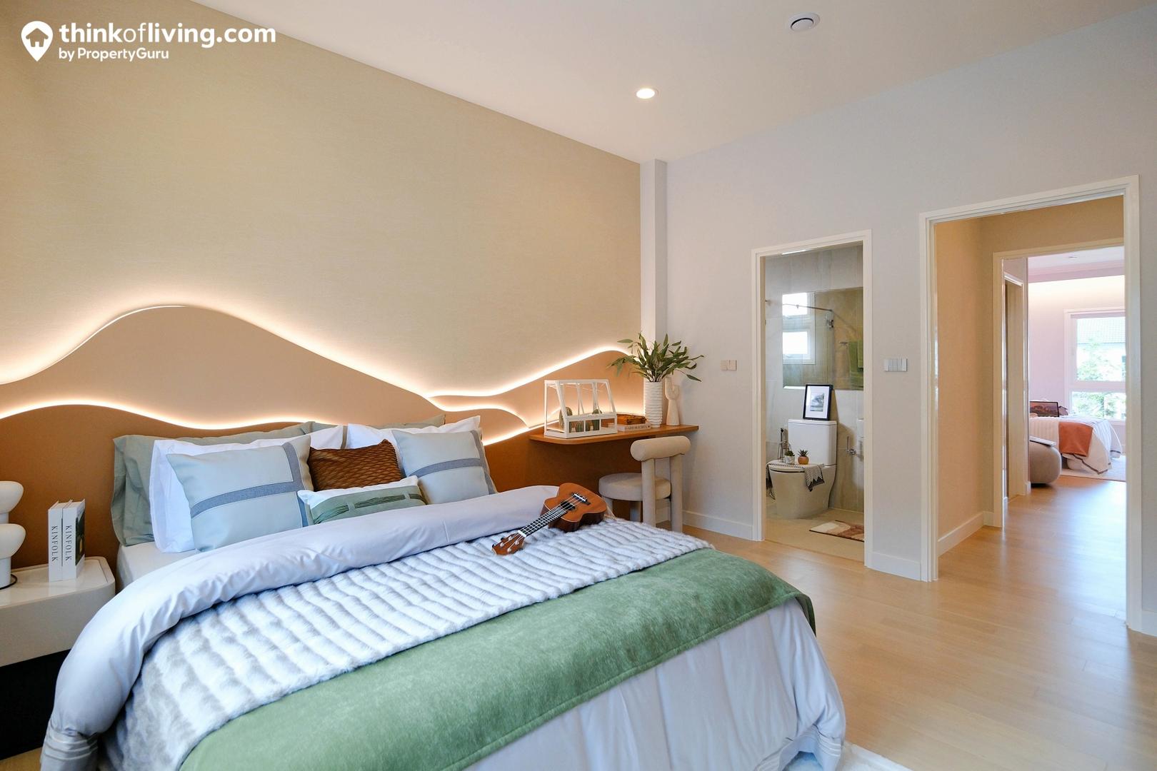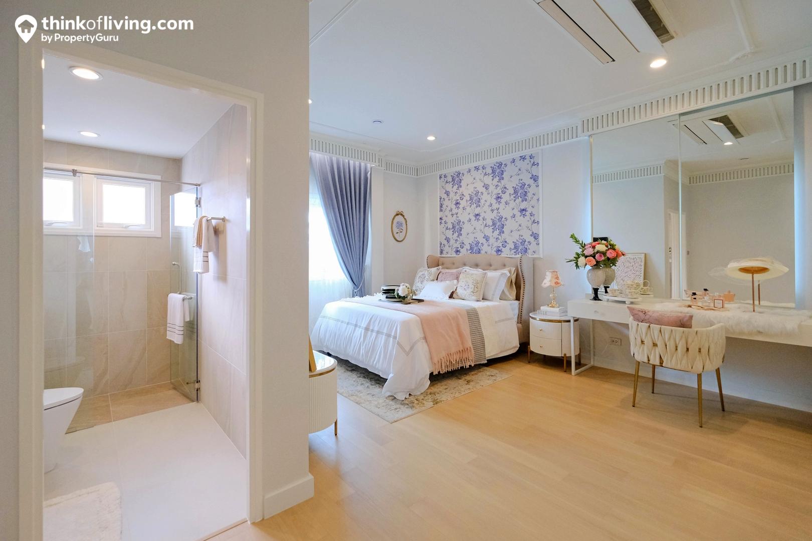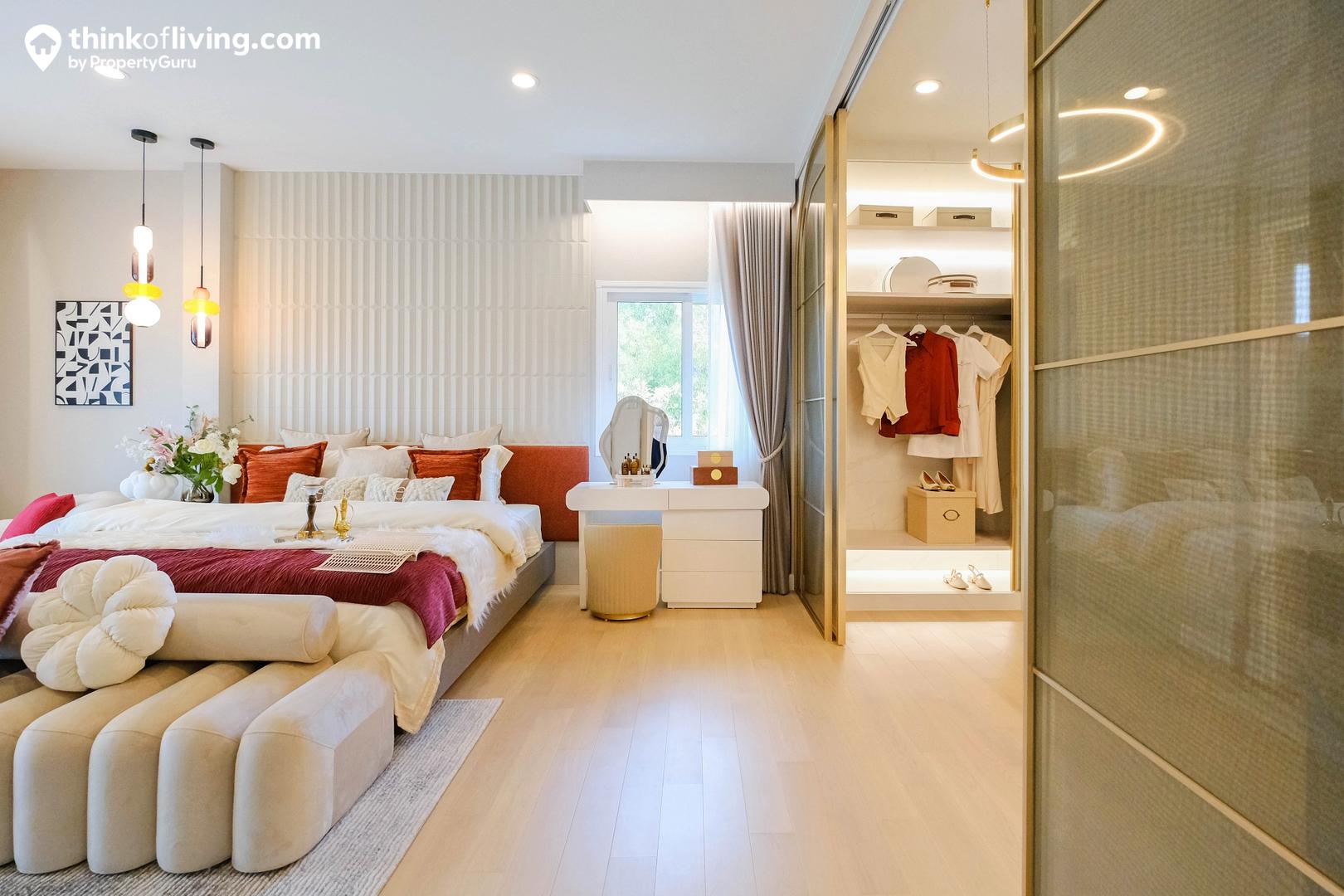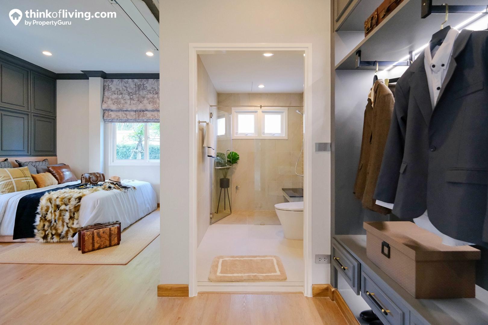 Master Bedroom ได้มาเป็นแบบหน้ากว้าง ประตูจะเปิดเข้าจากตรงกลาง พื้นที่ใช้งานแยกเป็น 2 ฝั่ง คือส่วนห้องนอ วางเตียงได้ 5 – 6 ฟุต มีมุมให้นั่งเล่นด้านข้าง และประตูเชื่อมต่อไปยังระเบียง อีกฝั่งเป็น Walk – in Closet ขนาดใหญ่ Built – in ตู้เสื้อผ้าและโต๊ะเครื่องแป้งเป็นรูปตัว C แบ่งกันใช้งาน 2 คนได้สบายๆ ตรงข้ามเป็นประตูทางเข้าห้องน้ำ เดินเชื่อมต่อใช้งานง่าย