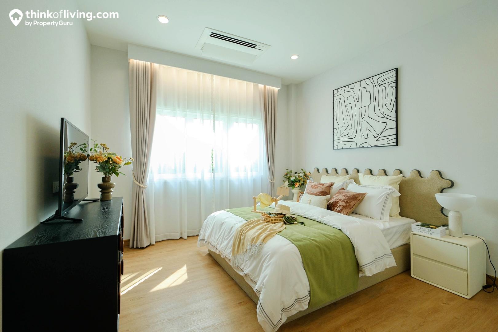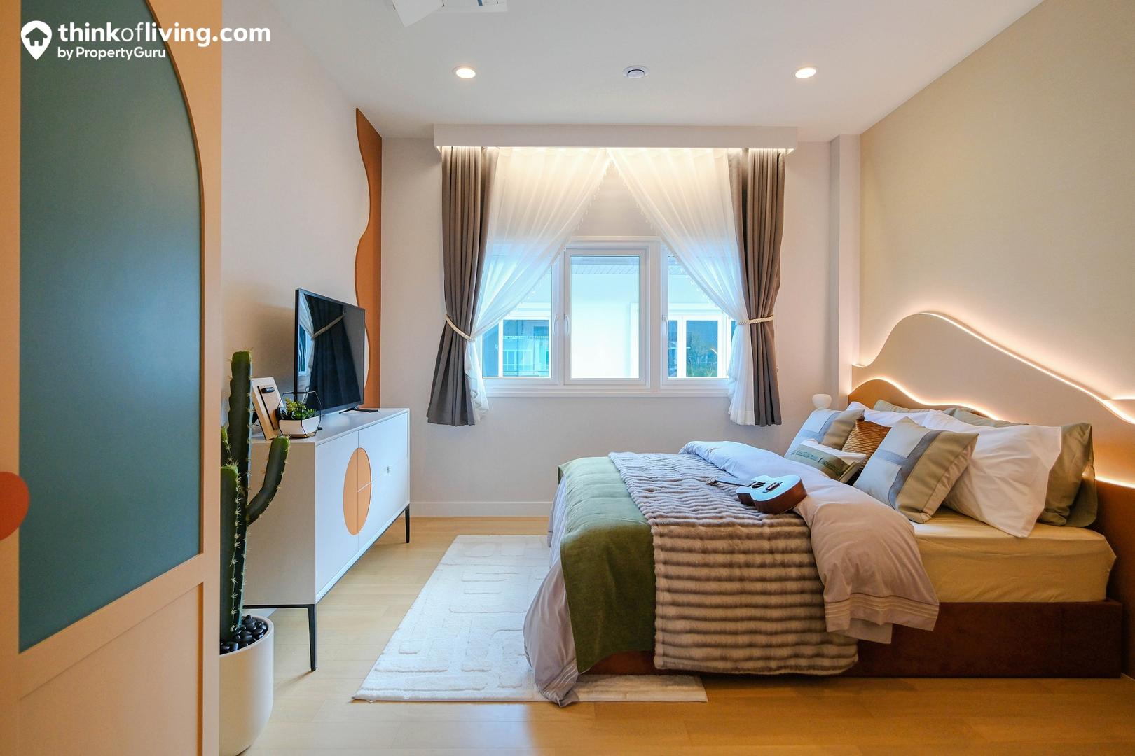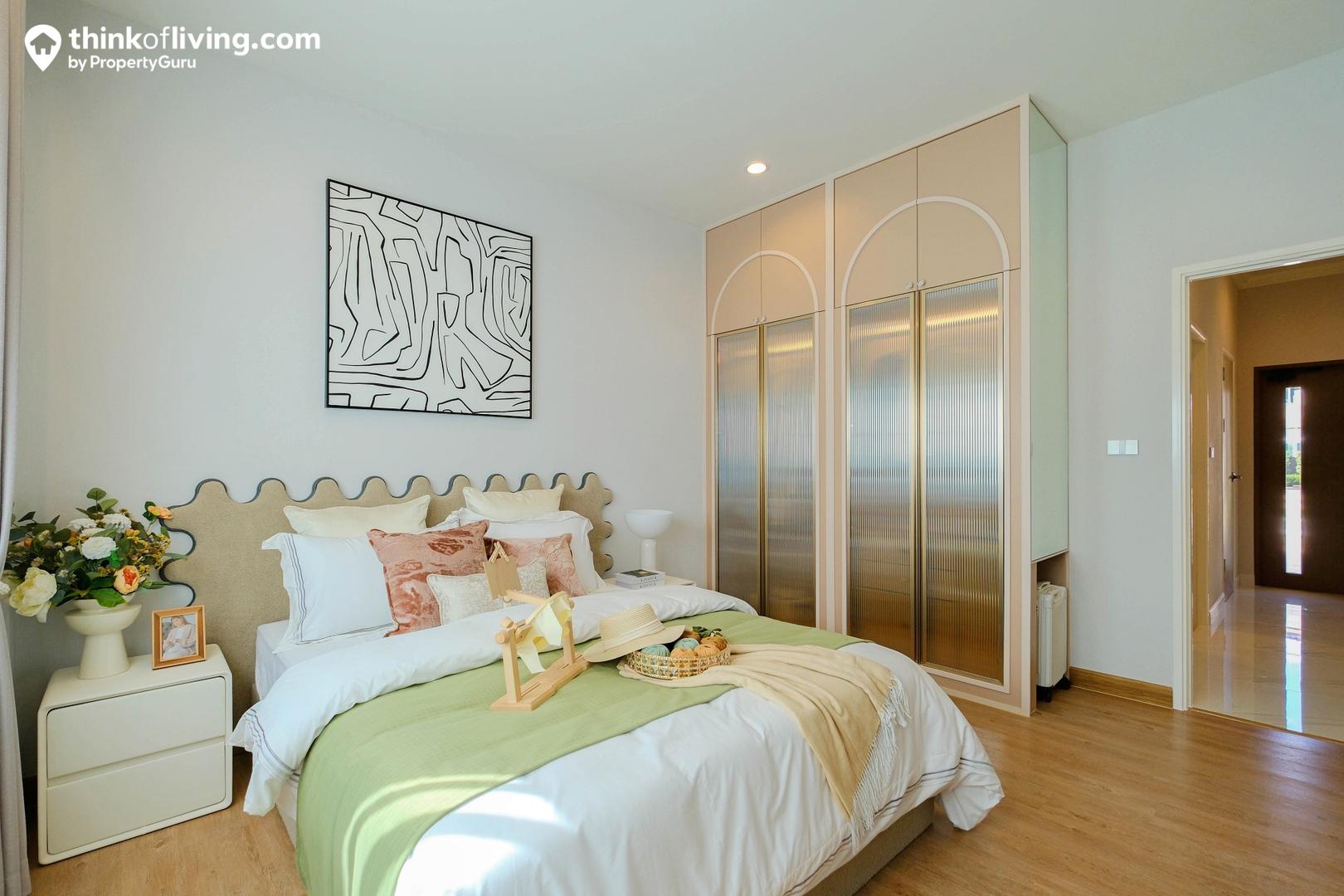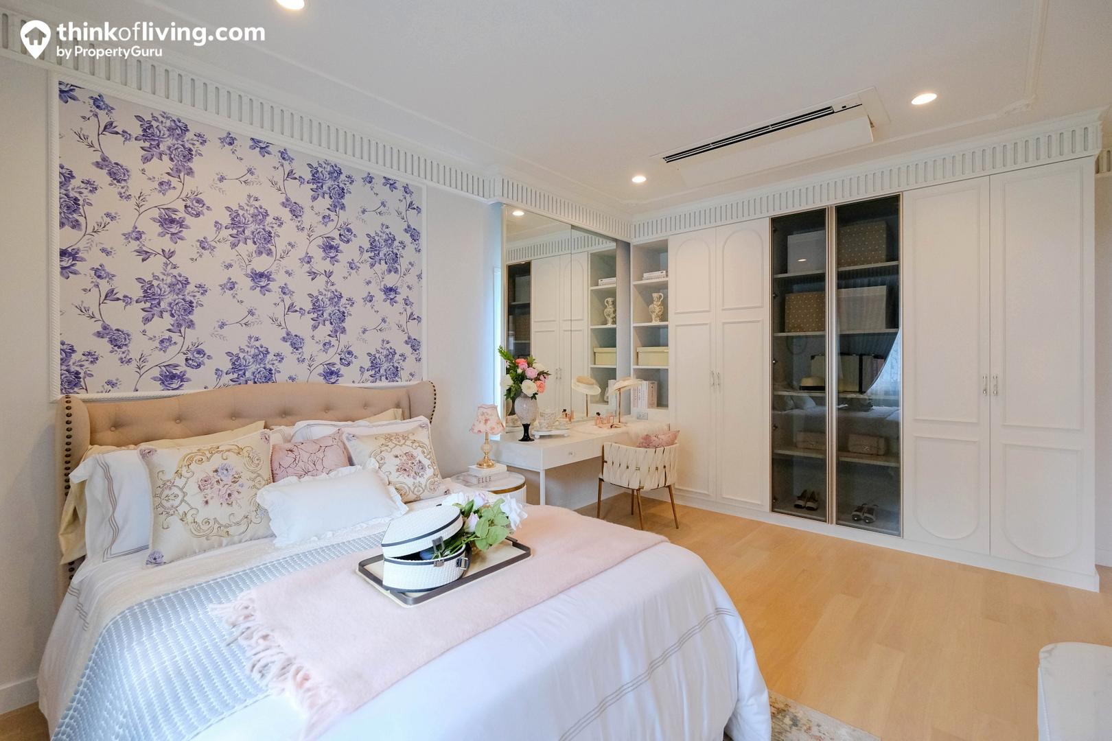 Master Bedroom ได้มาเป็นแบบหน้ากว้าง ประตูจะเปิดเข้าจากตรงกลาง พื้นที่ใช้งานแยกเป็น 2 ฝั่ง คือส่วนห้องนอ วางเตียงได้ 5 – 6 ฟุต มีมุมให้นั่งเล่นด้านข้าง และประตูเชื่อมต่อไปยังระเบียง อีกฝั่งเป็น Walk – in Closet ขนาดใหญ่ Built – in ตู้เสื้อผ้าและโต๊ะเครื่องแป้งเป็นรูปตัว C แบ่งกันใช้งาน 2 คนได้สบายๆ ตรงข้ามเป็นประตูทางเข้าห้องน้ำ เดินเชื่อมต่อใช้งานง่าย