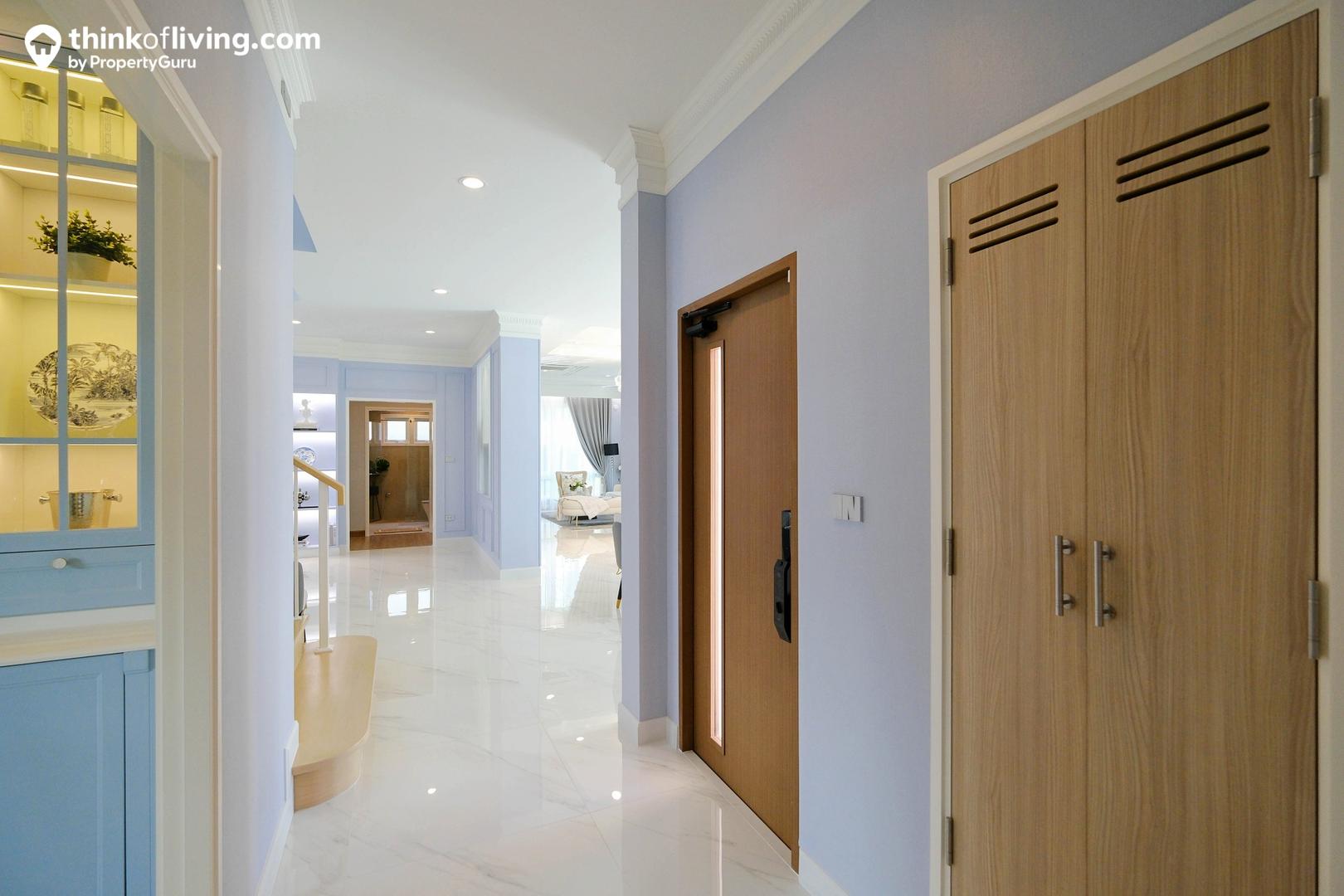 โถงทางเดินอีกฝั่งเชื่อมต่อกับประตู Service ด้านข้างมีตู้งานระบบ ไว้เปิดเช็ค ซ่อมแซมได้ง่าย มีห้องน้ำแบบ Powder Room และครัวปิดขนาดใหญ่ เหมาะกับบ้านที่เน้นทำอาหารทานเองได้