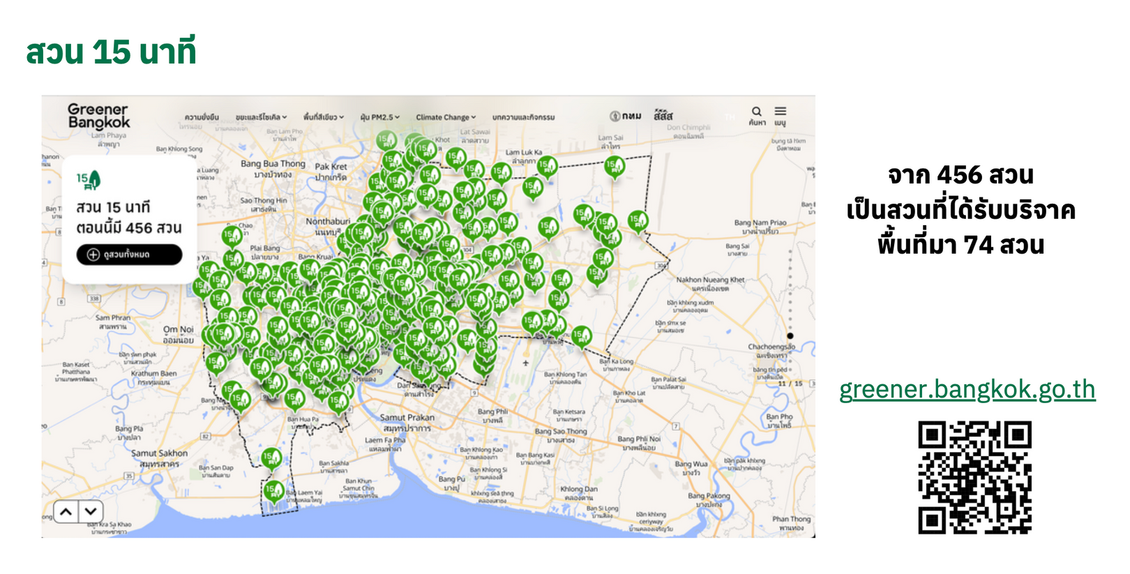 สวน 15 นาทีเป็นแนวคิดที่เกิดจากความต้องการเพิ่มพื้นที่สีเขียวให้ชาวกรุงได้มีสวนสาธารณะใกล้บ้าน เดินถึงได้ในระยะประมาณ 800 เมตร หรือเดินประมาณ 15 นาทีถึง!