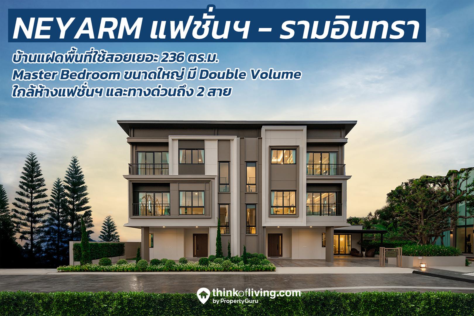 NEYARM Fasion – Ramintra (ณิยาม แฟชั่น – รามอินทรา) เป็นโครงการบ้านแฝดและทาวน์โฮม สูง 3 ชั้น จำนวน 148 ยูนิต ตั้งอยู่บนพื้นที่ดินขนาด 17 ไร่กว่า ออกแบบมาในสไตล์ Modern Luxury พร้อมส่วนกลางภายในโครงการขนาดใหญ่รวมกว่า 10 รายการ รวมถึงมี Golf Putting สำหรับพัดกอล์ฟเล่นภายใน Clubhouse ด้วย