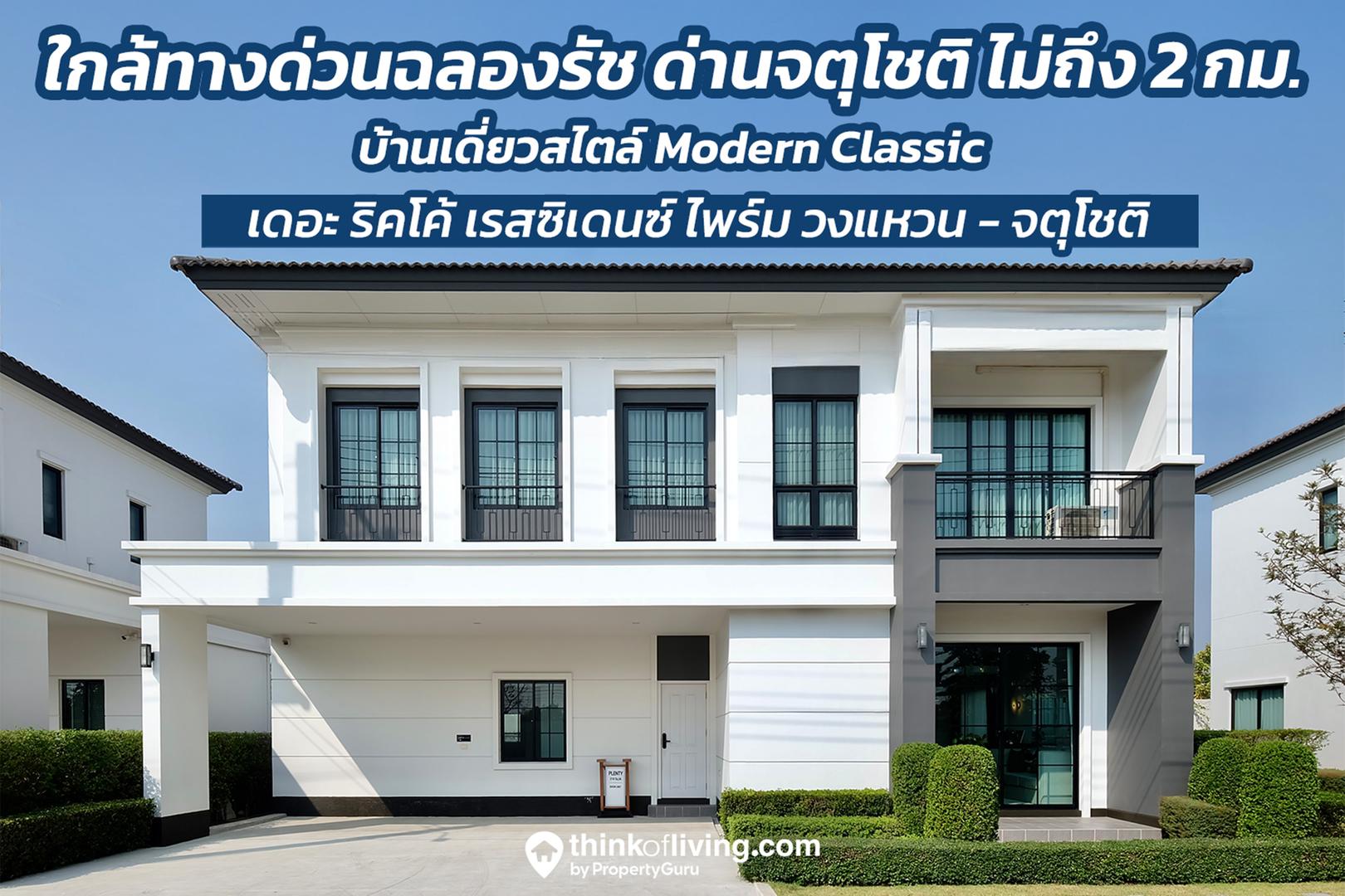 The Ricco Residence Prime Wongwaen-Chatuchot (เดอะ ริคโค้ เรสซิเดนซ์ ไพร์ม วงแหวนฯ-จตุโชติ) บ้านเดี่ยวสไตล์ Modern Classic ทำเลดีติดถนนเลียบวงแหวนกาญจนาภิเษก ใกล้ทางด่วนฉลองรัชด่านจตุโชติเพียง 1.7 กิโลเมตรเท่านั้น โครงการออกแบบบ้านให้มีลักษณะหน้ากว้าง ได้ช่องแสงหลายจุด ได้ความโปร่ง โล่ง รองรับสูงสุด 4 ห้องนอน จอดรถได้สูงสุด 3 คัน มีห้องนอนชั้นล่างทุกแบบ มาพร้อมส่วนกลางและพื้นที่สีเขียวแนวยาวรวมกว่า 1 ไร่ ราคาเริ่มต้น 7.19 ล้านบาท